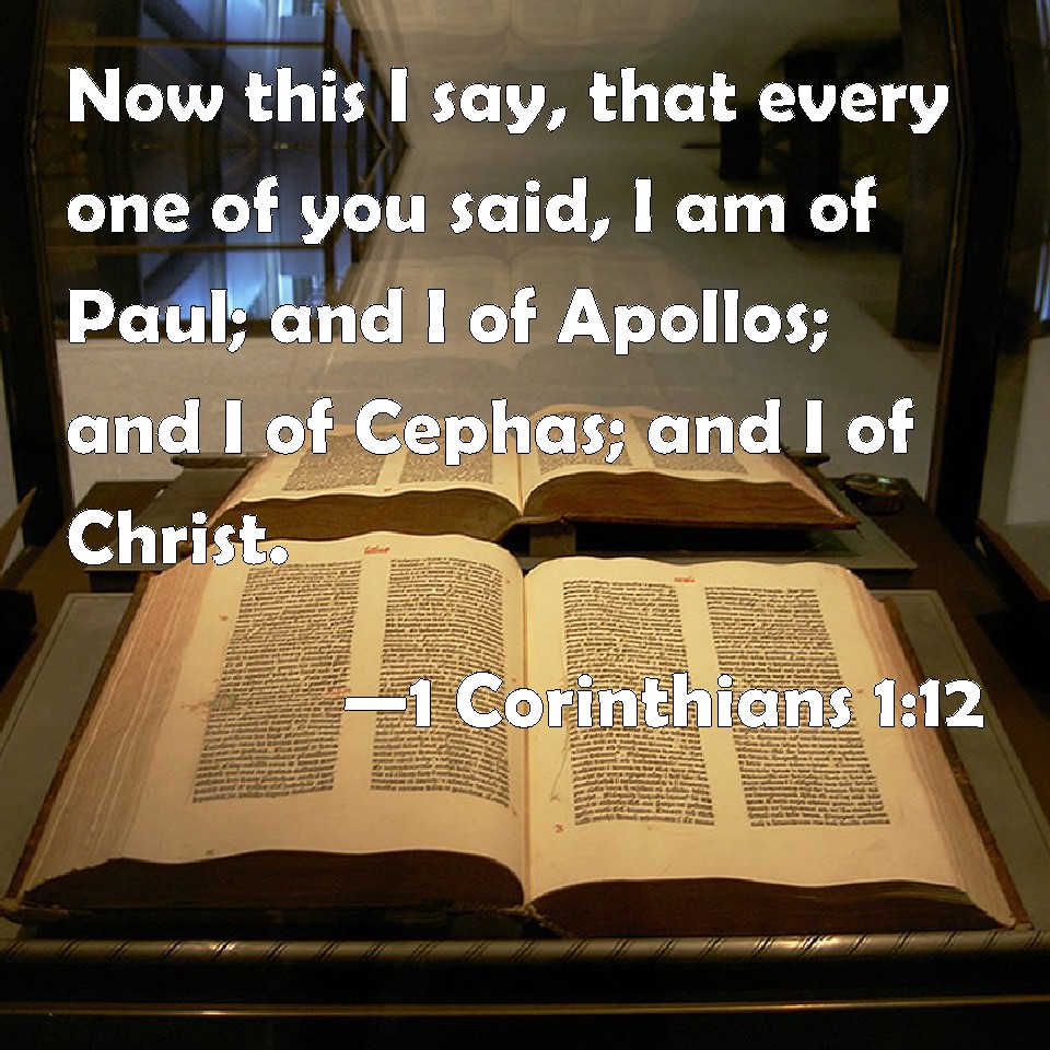 Choose a Background 1 Corinthians 1:12 Now this I say, that every one of you said, I am of Paul; and I of Apollos; and I of Cephas; and I of Christ. KJV: Now this I say, that every one of you saith, I am of Paul; and I of Apollos; and I of Cephas; and I of Christ. DRB: Now this I say, that every one of you saith: I indeed am of Paul; and I am of Apollo; and I am of Cephas; and I of Christ. DBT: But I speak of this, that each of you says, I am of Paul, and I of Apollos, and I of Cephas, and I of Christ. ERV: Now this I mean, that each one of you saith, I am of Paul; and I of Apollos; and I of Cephas; and I of Christ. WBT: Now this I say, that every one of you saith, I am of Paul; and I of Apollos; and I of Cephas; and I of Christ. WEB: Now I mean this, that each one of you says, "I follow Paul," "I follow Apollos," "I follow Cephas," and, "I follow Christ." YLT: and I say this, that each one of you saith, 'I, indeed, am of Paul' — 'and I of Apollos,' — 'and I of Cephas,' — 'and I of Christ.'Links 1 Corinthians 1:12 NIV • 1 Corinthians 1:12 NLT • 1 Corinthians 1:12 ESV • 1 Corinthians 1:12 NASB • 1 Corinthians 1:12 KJV • 1 Corinthians 1:12 Interlinear • 1 Corinthians 1:12 Commentaries • 1 Corinthians 1:12 Parallel Texts • 1 Corinthians 1:12 Bible Apps • 1 Corinthians 1:12 Parallel • Bible Hub |