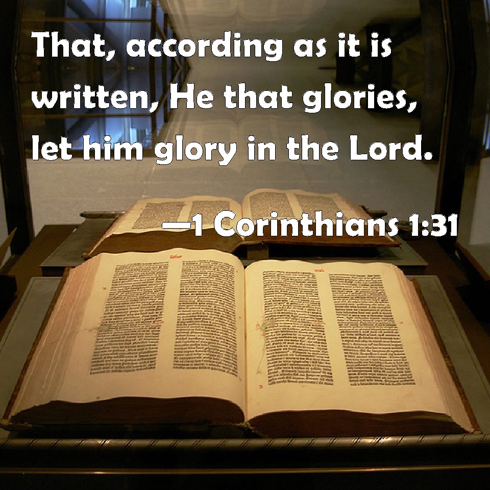 Choose a Background 1 Corinthians 1:31 That, according as it is written, He that glories, let him glory in the Lord. KJV: That, according as it is written, He that glorieth, let him glory in the Lord. DRB: That, as it is written: He that glorieth, may glory in the Lord. DBT: that according as it is written, He that boasts, let him boast in the Lord. ERV: that, according as it is written, He that glorieth, let him glory in the Lord. WBT: That, according as it is written, He that glorieth, let him glory in the Lord. WEB: that, according as it is written, "He who boasts, let him boast in the Lord." YLT: that, according as it hath been written, 'He who is glorying — in the Lord let him glory.'Links 1 Corinthians 1:31 NIV • 1 Corinthians 1:31 NLT • 1 Corinthians 1:31 ESV • 1 Corinthians 1:31 NASB • 1 Corinthians 1:31 KJV • 1 Corinthians 1:31 Interlinear • 1 Corinthians 1:31 Commentaries • 1 Corinthians 1:31 Parallel Texts • 1 Corinthians 1:31 Bible Apps • 1 Corinthians 1:31 Parallel • Bible Hub |