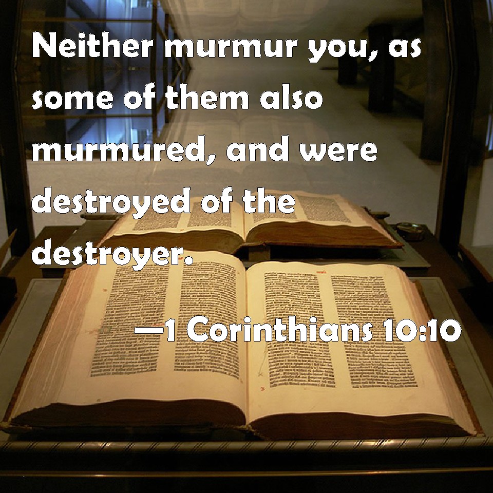 Choose a Background 1 Corinthians 10:10 Neither murmur you, as some of them also murmured, and were destroyed of the destroyer. KJV: Neither murmur ye, as some of them also murmured, and were destroyed of the destroyer. DRB: Neither do you murmur: as some of them murmured, and were destroyed by the destroyer. DBT: Neither murmur ye, as some of them murmured, and perished by the destroyer. ERV: Neither murmur ye, as some of them murmured, and perished by the destroyer. WBT: Neither murmur ye, as some of them also murmured, and were destroyed by the destroyer. WEB: Neither grumble, as some of them also grumbled, and perished by the destroyer. YLT: neither murmur ye, as also some of them did murmur, and did perish by the destroyer.Links 1 Corinthians 10:10 NIV • 1 Corinthians 10:10 NLT • 1 Corinthians 10:10 ESV • 1 Corinthians 10:10 NASB • 1 Corinthians 10:10 KJV • 1 Corinthians 10:10 Interlinear • 1 Corinthians 10:10 Commentaries • 1 Corinthians 10:10 Parallel Texts • 1 Corinthians 10:10 Bible Apps • 1 Corinthians 10:10 Parallel • Bible Hub |