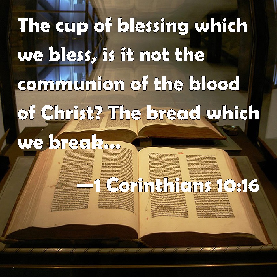 Choose a Background 1 Corinthians 10:16 The cup of blessing which we bless, is it not the communion of the blood of Christ? The bread which we break, is it not the communion of the body of Christ? KJV: The cup of blessing which we bless, is it not the communion of the blood of Christ? The bread which we break, is it not the communion of the body of Christ? DRB: The chalice of benediction, which we bless, is it not the communion of the blood of Christ ? And the bread, which we break, is it not the partaking of the body of the Lord ? DBT: The cup of blessing which we bless, is it not the communion of the blood of the Christ? The bread which we break, is it not the communion of the body of the Christ? ERV: The cup of blessing which we bless, is it not a communion of the blood of Christ? The bread which we break, is it not a communion of the body of Christ? WBT: The cup of blessing which we bless, is it not the communion of the blood of Christ? The bread which we break, is it not the communion of the body of Christ? WEB: The cup of blessing which we bless, isn't it a sharing of the blood of Christ? The bread which we break, isn't it a sharing of the body of Christ? YLT: The cup of the blessing that we bless — is it not the fellowship of the blood of the Christ? the bread that we break — is it not the fellowship of the body of the Christ?Links 1 Corinthians 10:16 NIV • 1 Corinthians 10:16 NLT • 1 Corinthians 10:16 ESV • 1 Corinthians 10:16 NASB • 1 Corinthians 10:16 KJV • 1 Corinthians 10:16 Interlinear • 1 Corinthians 10:16 Commentaries • 1 Corinthians 10:16 Parallel Texts • 1 Corinthians 10:16 Bible Apps • 1 Corinthians 10:16 Parallel • Bible Hub |