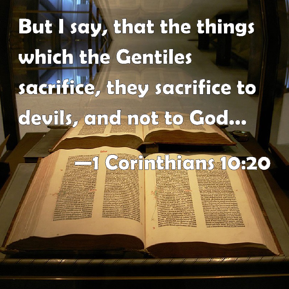 Choose a Background 1 Corinthians 10:20 But I say, that the things which the Gentiles sacrifice, they sacrifice to devils, and not to God: and I would not that you should have fellowship with devils. KJV: But I say, that the things which the Gentiles sacrifice, they sacrifice to devils, and not to God: and I would not that ye should have fellowship with devils. DRB: But the things which the heathens sacrifice, they sacrifice to devils, and not to God. And I would not that you should be made partakers with devils. DBT: But that what the nations sacrifice they sacrifice to demons, and not to God. Now I do not wish you to be in communion with demons. ERV: But I say, that the things which the Gentiles sacrifice, they sacrifice to devils, and not to God: and I would not that ye should have communion with devils. WBT: But I say, that the things which the Gentiles sacrifice, they sacrifice to demons, and not to God: and I would not that ye should have fellowship with demons. WEB: But I say that the things which the Gentiles sacrifice, they sacrifice to demons, and not to God, and I don't desire that you would have fellowship with demons. YLT: no, but that the things that the nations sacrifice — they sacrifice to demons and not to God; and I do not wish you to come into the fellowship of the demons.Links 1 Corinthians 10:20 NIV • 1 Corinthians 10:20 NLT • 1 Corinthians 10:20 ESV • 1 Corinthians 10:20 NASB • 1 Corinthians 10:20 KJV • 1 Corinthians 10:20 Interlinear • 1 Corinthians 10:20 Commentaries • 1 Corinthians 10:20 Parallel Texts • 1 Corinthians 10:20 Bible Apps • 1 Corinthians 10:20 Parallel • Bible Hub |