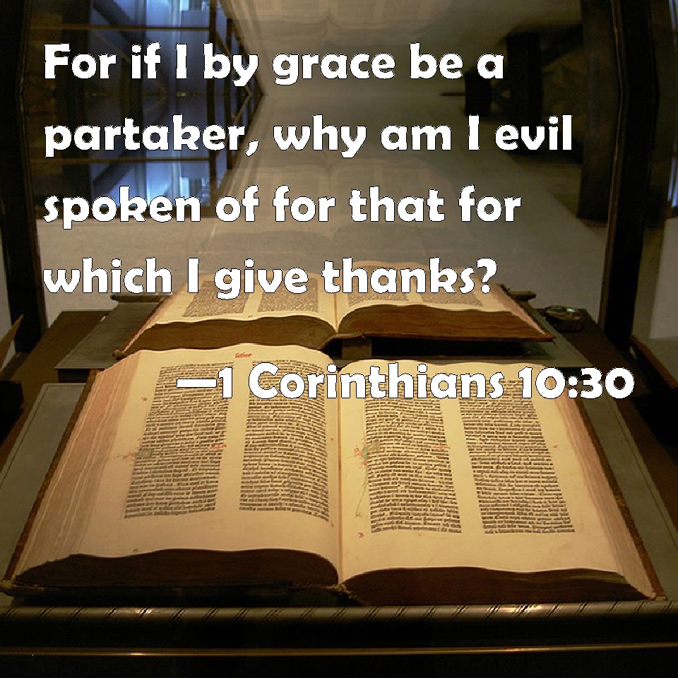 Choose a Background 1 Corinthians 10:30 For if I by grace be a partaker, why am I evil spoken of for that for which I give thanks? KJV: For if I by grace be a partaker, why am I evil spoken of for that for which I give thanks? DRB: If I partake with thanksgiving, why am I evil spoken of, for that for which I give thanks ? DBT: If I partake with thanksgiving, why am I spoken evil of for what I give thanks for? ERV: If I by grace partake, why am I evil spoken of for that for which I give thanks? WBT: For if I by grace am a partaker, why am I evil spoken of for that for which I give thanks? WEB: If I partake with thankfulness, why am I denounced for that for which I give thanks? YLT: and if I thankfully do partake, why am I evil spoken of, for that for which I give thanks?Links 1 Corinthians 10:30 NIV • 1 Corinthians 10:30 NLT • 1 Corinthians 10:30 ESV • 1 Corinthians 10:30 NASB • 1 Corinthians 10:30 KJV • 1 Corinthians 10:30 Interlinear • 1 Corinthians 10:30 Commentaries • 1 Corinthians 10:30 Parallel Texts • 1 Corinthians 10:30 Bible Apps • 1 Corinthians 10:30 Parallel • Bible Hub |