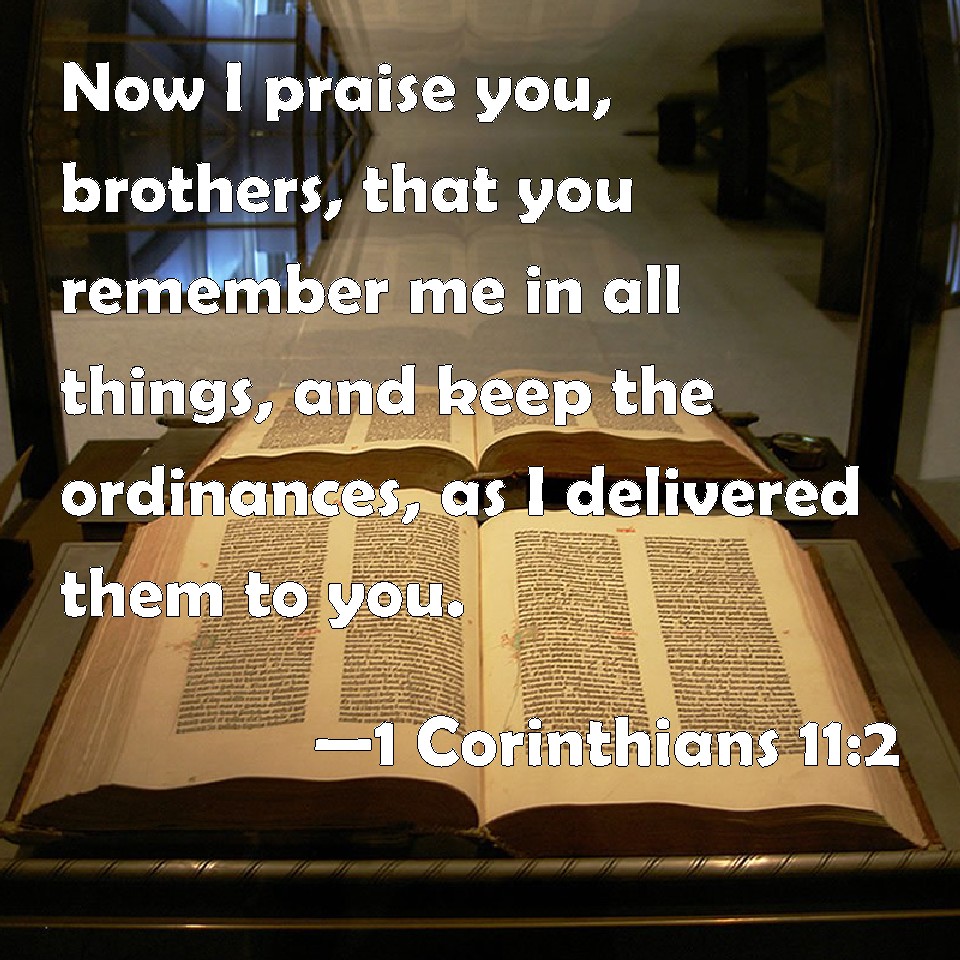 Choose a Background 1 Corinthians 11:2 Now I praise you, brothers, that you remember me in all things, and keep the ordinances, as I delivered them to you. KJV: Now I praise you, brethren, that ye remember me in all things, and keep the ordinances, as I delivered them to you. DRB: Now I praise you, brethren, that in all things you are mindful of me: and keep my ordinances as I have delivered them to you. DBT: Now I praise you, that in all things ye are mindful of me; and that as I have directed you, ye keep the directions. ERV: Now I praise you that ye remember me in all things, and hold fast the traditions, even as I delivered them to you. WBT: Now I praise you, brethren, that ye remember me in all things, and keep the ordinances, as I delivered them to you. WEB: Now I praise you, brothers, that you remember me in all things, and hold firm the traditions, even as I delivered them to you. YLT: And I praise you, brethren, that in all things ye remember me, and according as I did deliver to you, the deliverances ye keep,Links 1 Corinthians 11:2 NIV • 1 Corinthians 11:2 NLT • 1 Corinthians 11:2 ESV • 1 Corinthians 11:2 NASB • 1 Corinthians 11:2 KJV • 1 Corinthians 11:2 Interlinear • 1 Corinthians 11:2 Commentaries • 1 Corinthians 11:2 Parallel Texts • 1 Corinthians 11:2 Bible Apps • 1 Corinthians 11:2 Parallel • Bible Hub |