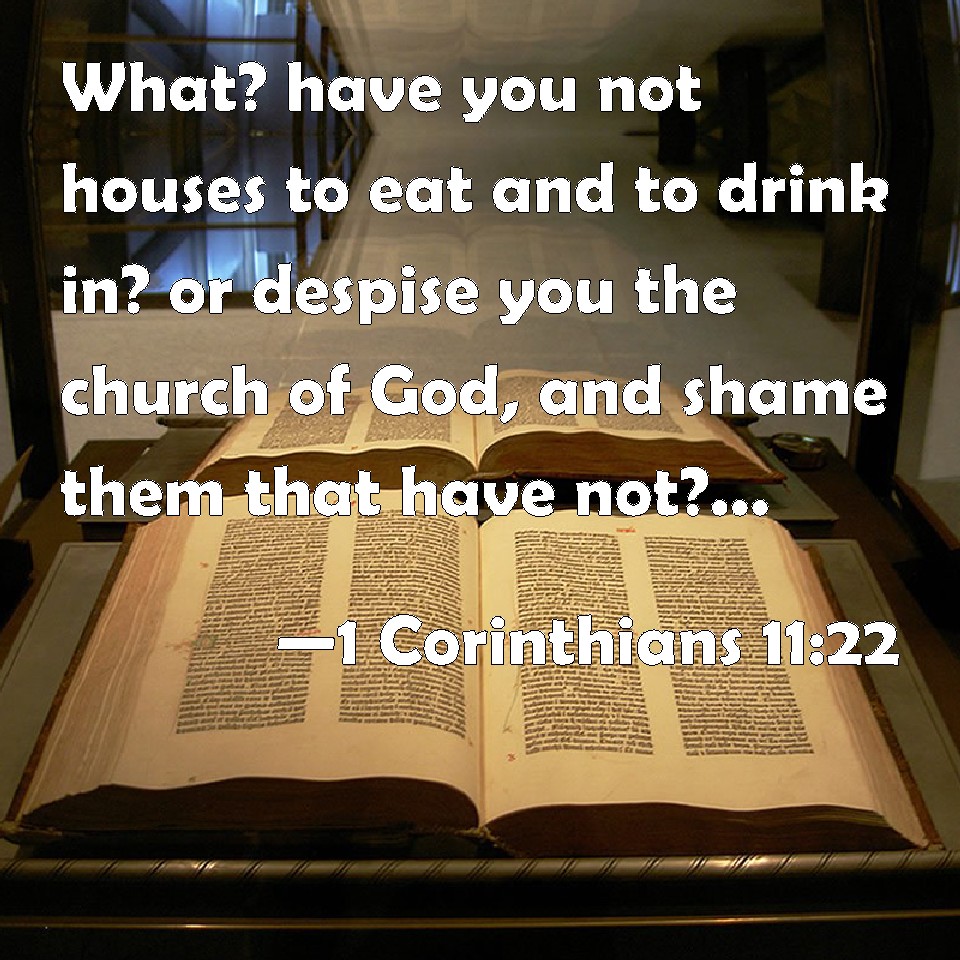 Choose a Background 1 Corinthians 11:22 What? have you not houses to eat and to drink in? or despise you the church of God, and shame them that have not? What shall I say to you? shall I praise you in this? I praise you not. KJV: What? have ye not houses to eat and to drink in? or despise ye the church of God, and shame them that have not? What shall I say to you? shall I praise you in this? I praise you not. DRB: What, have you not houses to eat and to drink in? Or despise ye the church of God; and put them to shame that have not ? What shall I say to you? Do I praise you? In this I praise you not. DBT: Have ye not then houses for eating and drinking? or do ye despise the assembly of God, and put to shame them who have not? What shall I say to you? shall I praise you? In this point I do not praise. ERV: What? have ye not houses to eat and to drink in? or despise ye the church of God, and put them to shame that have not? What shall I say to you? shall I praise you in this? I praise you not. WBT: What? have ye not houses to eat and to drink in? or despise ye the church of God, and shame them that have not? What shall I say to you? shall I praise you in this? I praise you not. WEB: What, don't you have houses to eat and to drink in? Or do you despise God's assembly, and put them to shame who don't have? What shall I tell you? Shall I praise you? In this I don't praise you. YLT: why, have ye not houses to eat and to drink in? or the assembly of God do ye despise, and shame those not having? what may I say to you? shall I praise you in this? I do not praise!Links 1 Corinthians 11:22 NIV • 1 Corinthians 11:22 NLT • 1 Corinthians 11:22 ESV • 1 Corinthians 11:22 NASB • 1 Corinthians 11:22 KJV • 1 Corinthians 11:22 Interlinear • 1 Corinthians 11:22 Commentaries • 1 Corinthians 11:22 Parallel Texts • 1 Corinthians 11:22 Bible Apps • 1 Corinthians 11:22 Parallel • Bible Hub |