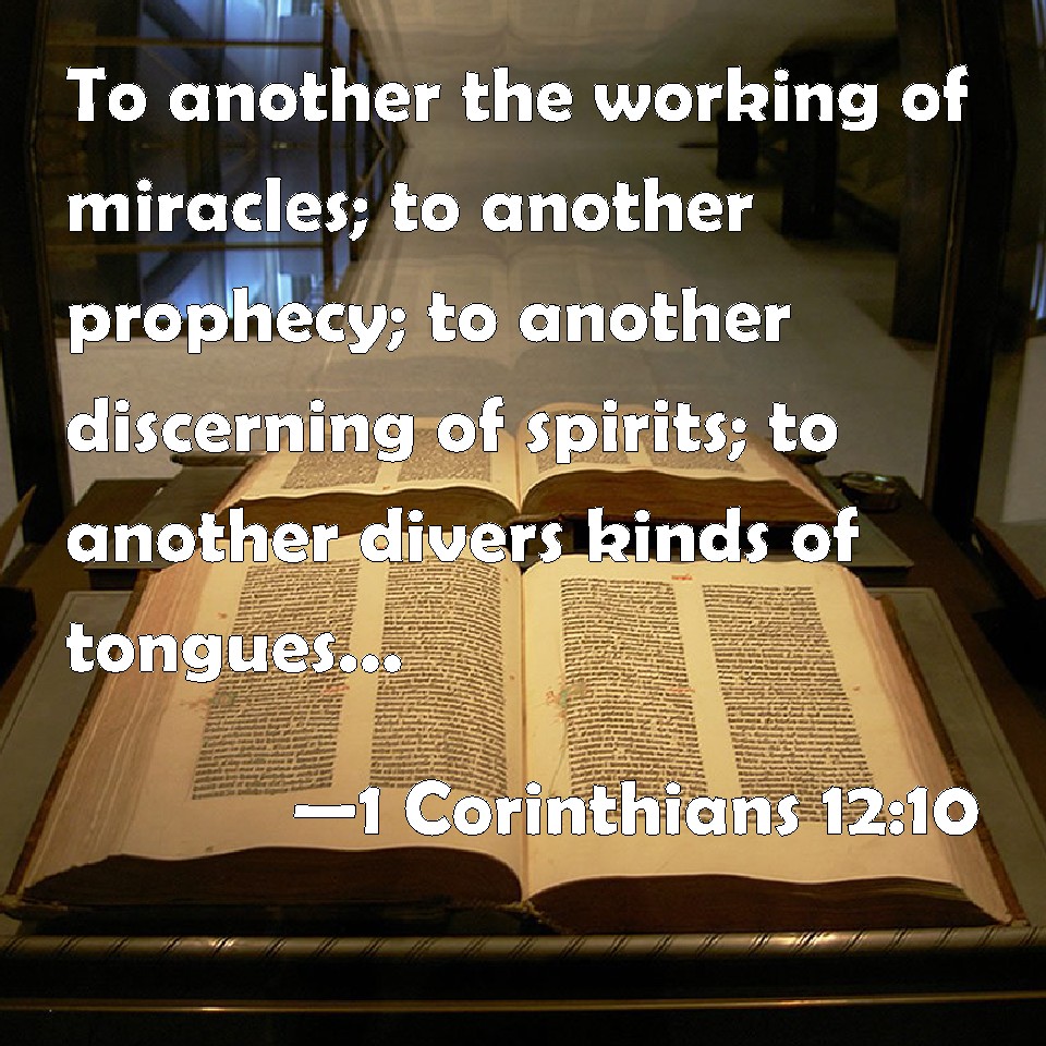Choose a Background 1 Corinthians 12:10 To another the working of miracles; to another prophecy; to another discerning of spirits; to another divers kinds of tongues; to another the interpretation of tongues: KJV: To another the working of miracles; to another prophecy; to another discerning of spirits; to another divers kinds of tongues; to another the interpretation of tongues: DRB: To another, the working of miracles; to another, prophecy; to another, the discerning of spirits; to another, diverse kinds of tongues; to another, interpretation of speeches. DBT: and to another operations of miracles; and to another prophecy; and to another discerning of spirits; and to a different one kinds of tongues; and to another interpretation of tongues. ERV: and to another workings of miracles; and to another prophecy; and to another discernings of spirits: to another divers kinds of tongues; and to another the interpretation of tongues: WBT: To another, the working of miracles; to another, prophecy; to another, discerning of spirits; to another, divers kinds of languages; to another, the interpretation of languages: WEB: and to another workings of miracles; and to another prophecy; and to another discerning of spirits; to another different kinds of languages; and to another the interpretation of languages. YLT: and to another in-workings of mighty deeds; and to another prophecy; and to another discernings of spirits; and to another divers kinds of tongues; and to another interpretation of tongues:Links 1 Corinthians 12:10 NIV • 1 Corinthians 12:10 NLT • 1 Corinthians 12:10 ESV • 1 Corinthians 12:10 NASB • 1 Corinthians 12:10 KJV • 1 Corinthians 12:10 Interlinear • 1 Corinthians 12:10 Commentaries • 1 Corinthians 12:10 Parallel Texts • 1 Corinthians 12:10 Bible Apps • 1 Corinthians 12:10 Parallel • Bible Hub |