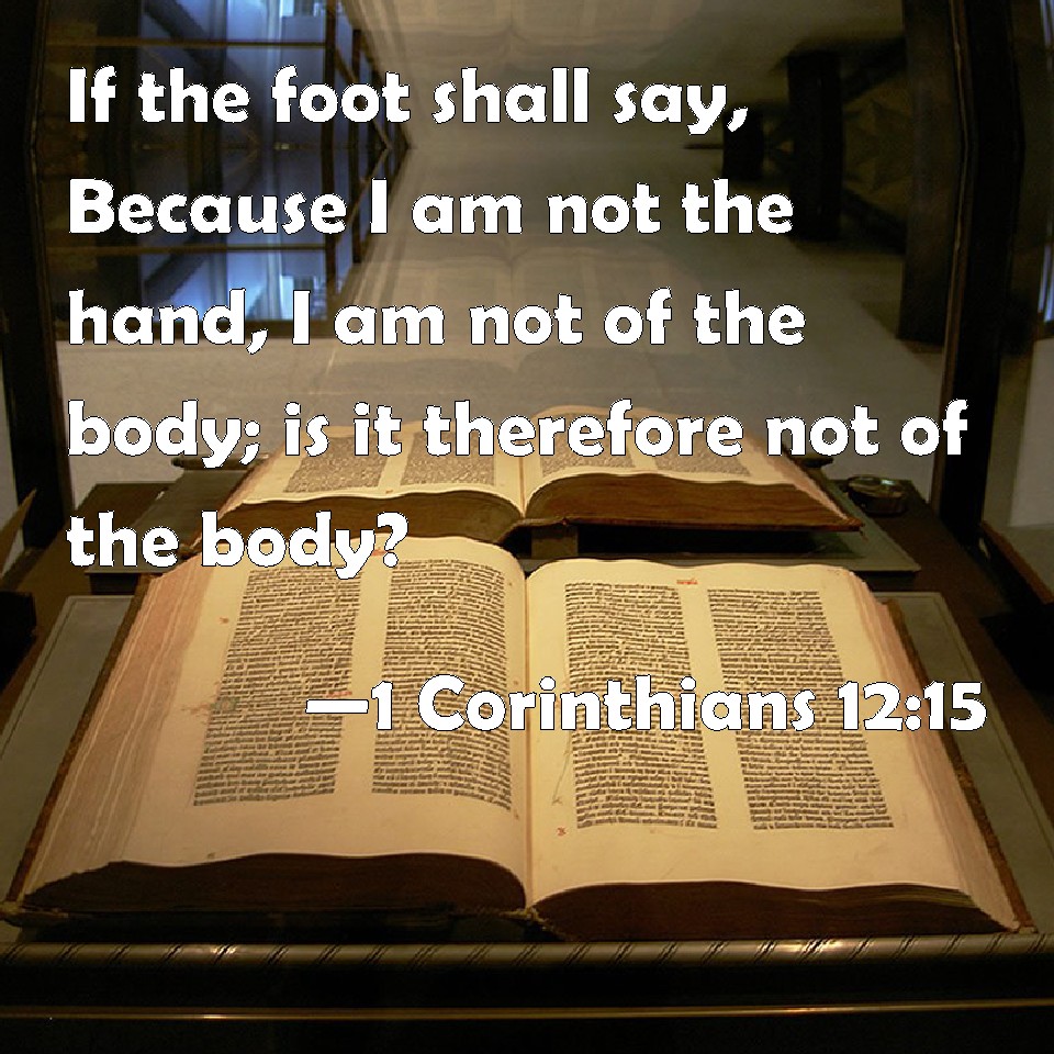 Choose a Background 1 Corinthians 12:15 If the foot shall say, Because I am not the hand, I am not of the body; is it therefore not of the body? KJV: If the foot shall say, Because I am not the hand, I am not of the body; is it therefore not of the body? DRB: If the foot should say, because I am not the hand, I am not of the body; is it therefore not of the body ? DBT: If the foot say, Because I am not a hand I am not of the body, is it on account of this not indeed of the body? ERV: If the foot shall say, Because I am not the hand, I am not of the body; it is not therefore not of the body. WBT: If the foot shall say, Because I am not the hand, I am not of the body; is it therefore not of the body? WEB: If the foot would say, "Because I'm not the hand, I'm not part of the body," it is not therefore not part of the body. YLT: if the foot may say, 'Because I am not a hand, I am not of the body;' it is not, because of this, not of the body;Links 1 Corinthians 12:15 NIV • 1 Corinthians 12:15 NLT • 1 Corinthians 12:15 ESV • 1 Corinthians 12:15 NASB • 1 Corinthians 12:15 KJV • 1 Corinthians 12:15 Interlinear • 1 Corinthians 12:15 Commentaries • 1 Corinthians 12:15 Parallel Texts • 1 Corinthians 12:15 Bible Apps • 1 Corinthians 12:15 Parallel • Bible Hub |