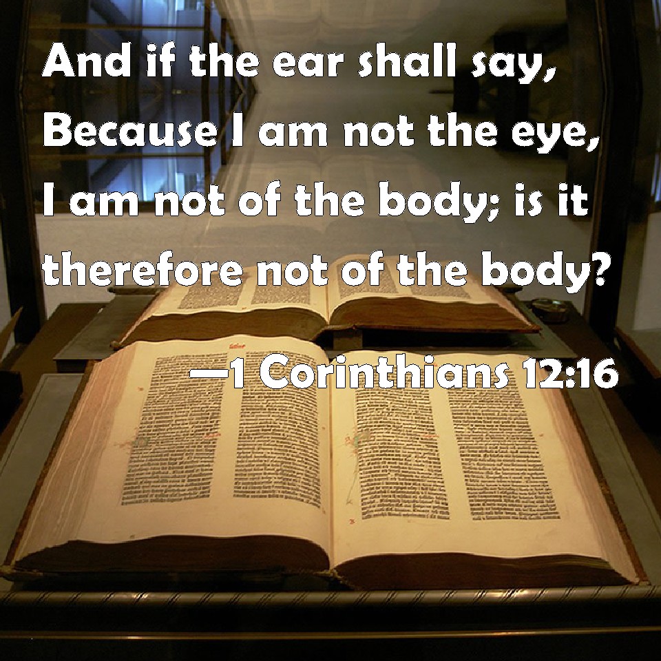 Choose a Background 1 Corinthians 12:16 And if the ear shall say, Because I am not the eye, I am not of the body; is it therefore not of the body? KJV: And if the ear shall say, Because I am not the eye, I am not of the body; is it therefore not of the body? DRB: And if the ear should say, because I am not the eye, I am not of the body; is it therefore not of the body ? DBT: And if the ear say, Because I am not an eye I am not of the body, is it on account of this not indeed of the body? ERV: And if the ear shall say, Because I am not the eye, I am not of the body; it is not therefore not of the body. WBT: And if the ear shall say, Because I am not the eye, I am not of the body; is it therefore not of the body? WEB: If the ear would say, "Because I'm not the eye, I'm not part of the body," it's not therefore not part of the body. YLT: and if the ear may say, 'Because I am not an eye, I am not of the body;' it is not, because of this, not of the body?Links 1 Corinthians 12:16 NIV • 1 Corinthians 12:16 NLT • 1 Corinthians 12:16 ESV • 1 Corinthians 12:16 NASB • 1 Corinthians 12:16 KJV • 1 Corinthians 12:16 Interlinear • 1 Corinthians 12:16 Commentaries • 1 Corinthians 12:16 Parallel Texts • 1 Corinthians 12:16 Bible Apps • 1 Corinthians 12:16 Parallel • Bible Hub |