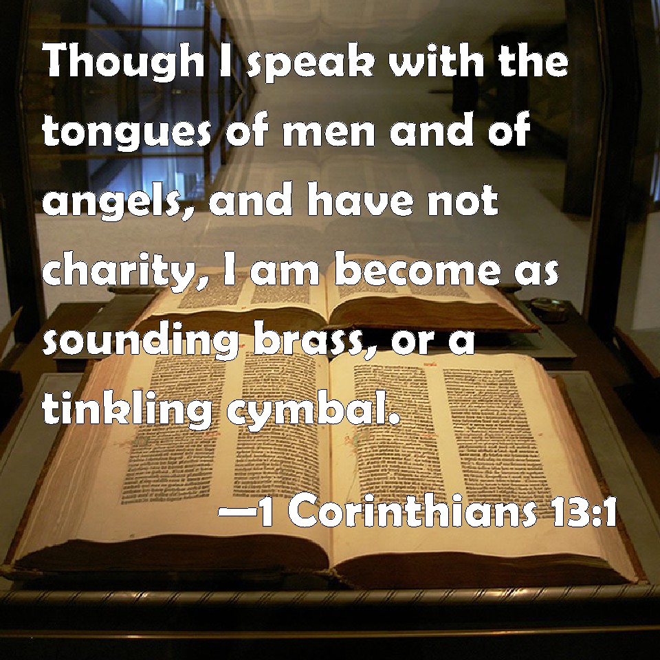 Choose a Background 1 Corinthians 13:1 Though I speak with the tongues of men and of angels, and have not charity, I am become as sounding brass, or a tinkling cymbal. KJV: Though I speak with the tongues of men and of angels, and have not charity, I am become as sounding brass, or a tinkling cymbal. DRB: IF I speak with the tongues of men, and of angels, and have not charity, I am become as sounding brass, or a tinkling cymbal. DBT: If I speak with the tongues of men and of angels, but have not love, I am become sounding brass or a clanging cymbal. ERV: If I speak with the tongues of men and of angels, but have not love, I am become sounding brass, or a clanging cymbal. WBT: Though I speak with the tongues of men and of angels, and have not charity, I am become as sounding brass, or a tinkling cymbal. WEB: If I speak with the languages of men and of angels, but don't have love, I have become sounding brass, or a clanging cymbal. YLT: If with the tongues of men and of messengers I speak, and have not love, I have become brass sounding, or a cymbal tinkling;Links 1 Corinthians 13:1 NIV • 1 Corinthians 13:1 NLT • 1 Corinthians 13:1 ESV • 1 Corinthians 13:1 NASB • 1 Corinthians 13:1 KJV • 1 Corinthians 13:1 Interlinear • 1 Corinthians 13:1 Commentaries • 1 Corinthians 13:1 Parallel Texts • 1 Corinthians 13:1 Bible Apps • 1 Corinthians 13:1 Parallel • Bible Hub |