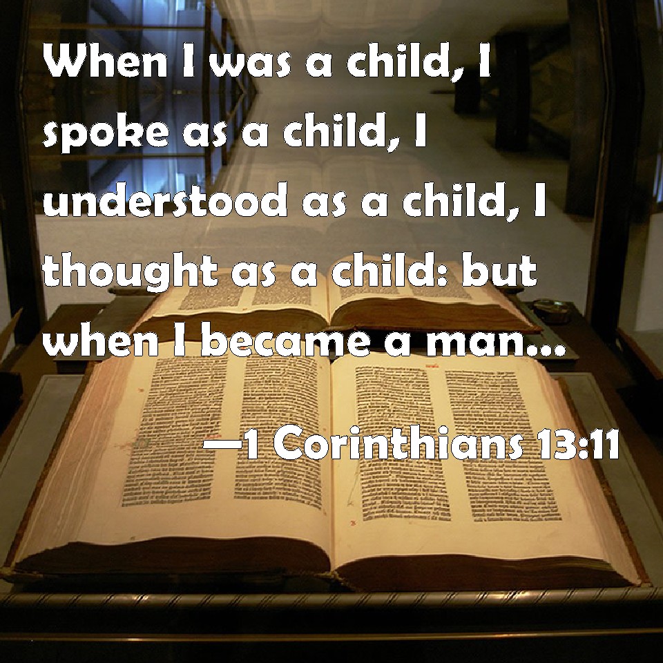 Choose a Background 1 Corinthians 13:11 When I was a child, I spoke as a child, I understood as a child, I thought as a child: but when I became a man, I put away childish things. KJV: When I was a child, I spake as a child, I understood as a child, I thought as a child: but when I became a man, I put away childish things. DRB: When I was a child, I spoke as a child, I understood as a child, I thought as a child. But, when I became a man, I put away the things of a child. DBT: When I was a child, I spoke as a child, I felt as a child, I reasoned as a child; when I became a man, I had done with what belonged to the child. ERV: When I was a child, I spake as a child, I felt as a child, I thought as a child: now that I am become a man, I have put away childish things. WBT: When I was a child, I spoke as a child, I understood as a child, I thought as a child: but when I became a man, I put away childish things. WEB: When I was a child, I spoke as a child, I felt as a child, I thought as a child. Now that I have become a man, I have put away childish things. YLT: When I was a babe, as a babe I was speaking, as a babe I was thinking, as a babe I was reasoning, and when I have become a man, I have made useless the things of the babe;Links 1 Corinthians 13:11 NIV • 1 Corinthians 13:11 NLT • 1 Corinthians 13:11 ESV • 1 Corinthians 13:11 NASB • 1 Corinthians 13:11 KJV • 1 Corinthians 13:11 Interlinear • 1 Corinthians 13:11 Commentaries • 1 Corinthians 13:11 Parallel Texts • 1 Corinthians 13:11 Bible Apps • 1 Corinthians 13:11 Parallel • Bible Hub |