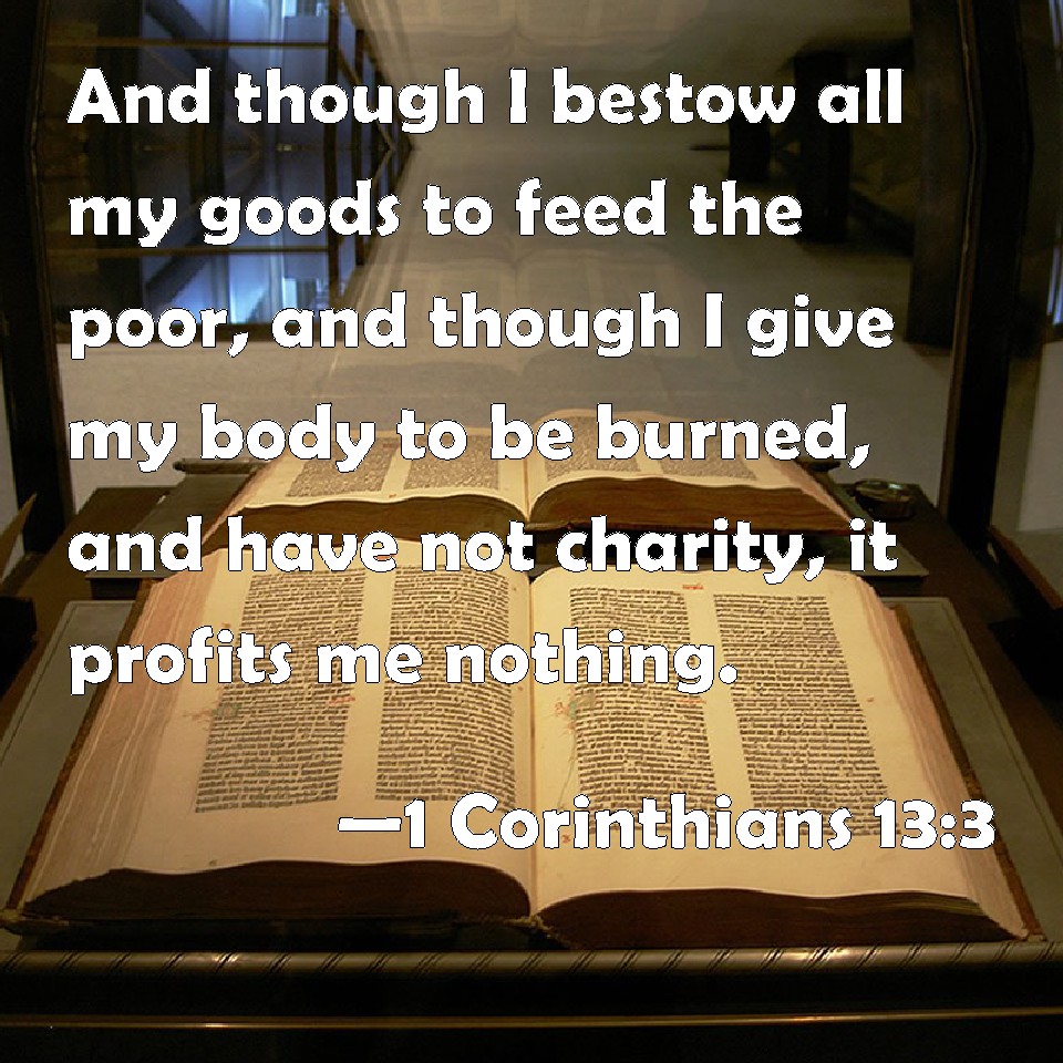 Choose a Background 1 Corinthians 13:3 And though I bestow all my goods to feed the poor, and though I give my body to be burned, and have not charity, it profits me nothing. KJV: And though I bestow all my goods to feed the poor, and though I give my body to be burned, and have not charity, it profiteth me nothing. DRB: And if I should distribute all my goods to feed the poor, and if I should deliver my body to be burned, and have not charity, it profiteth me nothing. DBT: And if I shall dole out all my goods in food, and if I deliver up my body that I may be burned, but have not love, I profit nothing. ERV: And if I bestow all my goods to feed the poor, and if I give my body to be burned, but have not love, it profiteth me nothing. WBT: And though I bestow all my goods to feed the poor, and though I give my body to be burned, and have not charity, it profiteth me nothing. WEB: If I dole out all my goods to feed the poor, and if I give my body to be burned, but don't have love, it profits me nothing. YLT: and if I give away to feed others all my goods, and if I give up my body that I may be burned, and have not love, I am profited nothing.Links 1 Corinthians 13:3 NIV • 1 Corinthians 13:3 NLT • 1 Corinthians 13:3 ESV • 1 Corinthians 13:3 NASB • 1 Corinthians 13:3 KJV • 1 Corinthians 13:3 Interlinear • 1 Corinthians 13:3 Commentaries • 1 Corinthians 13:3 Parallel Texts • 1 Corinthians 13:3 Bible Apps • 1 Corinthians 13:3 Parallel • Bible Hub |