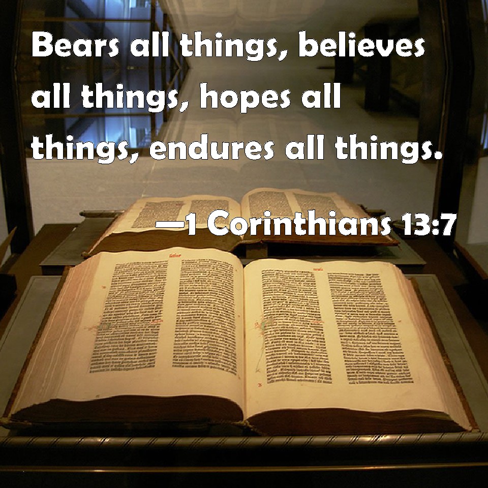 Choose a Background 1 Corinthians 13:7 Bears all things, believes all things, hopes all things, endures all things. KJV: Beareth all things, believeth all things, hopeth all things, endureth all things. DRB: Beareth all things, believeth all things, hopeth all things, endureth all things. DBT: bears all things, believes all things, hopes all things, endures all things. ERV: beareth all things, believeth all things, hopeth all things, endureth all things. WBT: Beareth all things, believeth all things, hopeth all things, endureth all things. WEB: bears all things, believes all things, hopes all things, endures all things. YLT: all things it beareth, all it believeth, all it hopeth, all it endureth.Links 1 Corinthians 13:7 NIV • 1 Corinthians 13:7 NLT • 1 Corinthians 13:7 ESV • 1 Corinthians 13:7 NASB • 1 Corinthians 13:7 KJV • 1 Corinthians 13:7 Interlinear • 1 Corinthians 13:7 Commentaries • 1 Corinthians 13:7 Parallel Texts • 1 Corinthians 13:7 Bible Apps • 1 Corinthians 13:7 Parallel • Bible Hub |