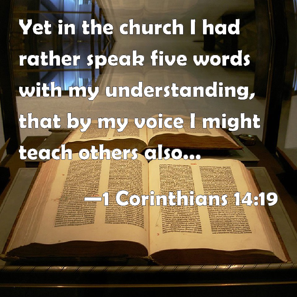 1 Corinthians 14:19 Yet in the church I had rather speak five words with my understanding, that by my voice I might teach others also, than ten thousand words in an unknown tongue.