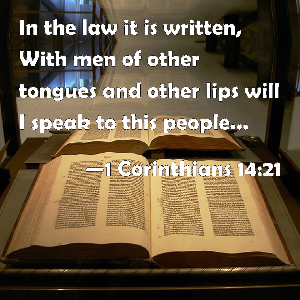 Choose a Background 1 Corinthians 14:21 In the law it is written, With men of other tongues and other lips will I speak to this people; and yet for all that will they not hear me, said the LORD. KJV: In the law it is written, With men of other tongues and other lips will I speak unto this people; and yet for all that will they not hear me, saith the Lord. DRB: In the law it is written: In other tongues and other lips I will speak to this people; and neither so will they hear me, saith the Lord. DBT: It is written in the law, By people of other tongues, and by strange lips, will I speak to this people; and neither thus will they hear me, saith the Lord. ERV: In the law it is written, By men of strange tongues and by the lips of strangers will I speak unto this people; and not even thus will they hear me, saith the Lord. WBT: In the law it is written, With men of other tongues and other lips will I speak to this people; and yet for all that will they not hear me, saith the Lord. WEB: In the law it is written, "By men of strange languages and by the lips of strangers I will speak to this people. Not even thus will they hear me, says the Lord." YLT: in the law it hath been written, that, 'With other tongues and with other lips I will speak to this people, and not even so will they hear Me, saith the Lord;'Links 1 Corinthians 14:21 NIV • 1 Corinthians 14:21 NLT • 1 Corinthians 14:21 ESV • 1 Corinthians 14:21 NASB • 1 Corinthians 14:21 KJV • 1 Corinthians 14:21 Interlinear • 1 Corinthians 14:21 Commentaries • 1 Corinthians 14:21 Parallel Texts • 1 Corinthians 14:21 Bible Apps • 1 Corinthians 14:21 Parallel • Bible Hub |