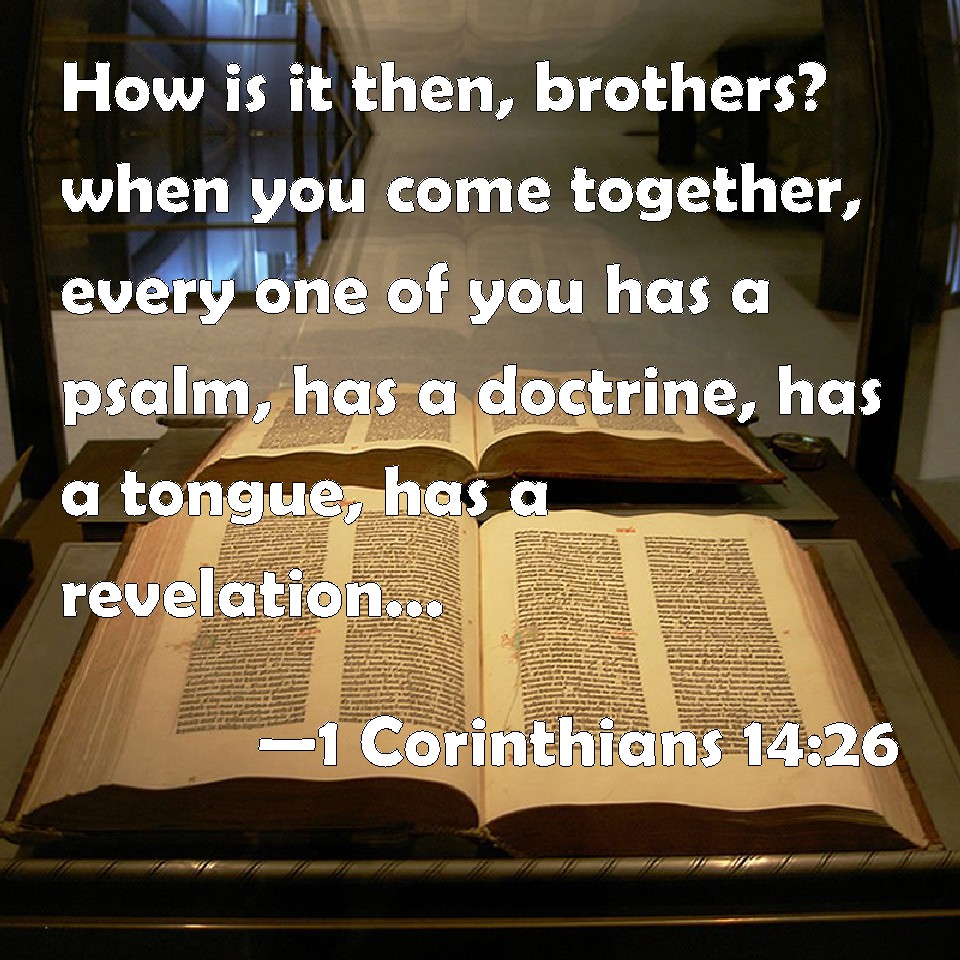Choose a Background 1 Corinthians 14:26 How is it then, brothers? when you come together, every one of you has a psalm, has a doctrine, has a tongue, has a revelation, has an interpretation. Let all things be done to edifying. KJV: How is it then, brethren? when ye come together, every one of you hath a psalm, hath a doctrine, hath a tongue, hath a revelation, hath an interpretation. Let all things be done unto edifying. DRB: How is it then, brethren ? When you come together, every one of you hath a psalm, hath a doctrine, hath a revelation, hath a tongue, hath an interpretation: let all things be done to edification. DBT: What is it then, brethren? whenever ye come together, each of you has a psalm, has a teaching, has a tongue, has a revelation, has an interpretation. Let all things be done to edification. ERV: What is it then, brethren? When ye come together, each one hath a psalm, hath a teaching, hath a revelation, hath a tongue, hath an interpretation. Let all things be done unto edifying. WBT: How is it then, brethren? when ye are assembled, every one of you hath a psalm, hath a doctrine, hath a language, hath a revelation, hath an interpretation. Let all things be done to edification. WEB: What is it then, brothers? When you come together, each one of you has a psalm, has a teaching, has a revelation, has another language, has an interpretation. Let all things be done to build each other up. YLT: What then is it, brethren? whenever ye may come together, each of you hath a psalm, hath a teaching, hath a tongue, hath a revelation, hath an interpretation? let all things be for building up;Links 1 Corinthians 14:26 NIV • 1 Corinthians 14:26 NLT • 1 Corinthians 14:26 ESV • 1 Corinthians 14:26 NASB • 1 Corinthians 14:26 KJV • 1 Corinthians 14:26 Interlinear • 1 Corinthians 14:26 Commentaries • 1 Corinthians 14:26 Parallel Texts • 1 Corinthians 14:26 Bible Apps • 1 Corinthians 14:26 Parallel • Bible Hub |