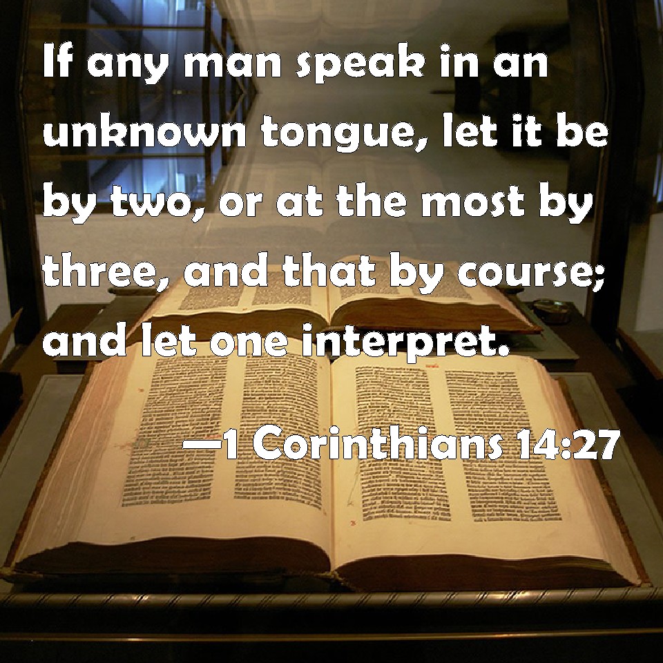 Choose a Background 1 Corinthians 14:27 If any man speak in an unknown tongue, let it be by two, or at the most by three, and that by course; and let one interpret. KJV: If any man speak in an unknown tongue, let it be by two, or at the most by three, and that by course; and let one interpret. DRB: If any speak with a tongue, let it be by two, or at the most by three, and in course, and let one interpret. DBT: If any one speak with a tongue, let it be two, or at the most three, and separately, and let one interpret; ERV: If any man speaketh in a tongue, let it be by two, or at the most three, and that in turn; and let one interpret: WBT: If any man speaketh in an unknown language, let it be by two, or at the most by three, and that by course; and let one interpret. WEB: If any man speaks in another language, let it be two, or at the most three, and in turn; and let one interpret. YLT: if an unknown tongue any one do speak, by two, or at the most, by three, and in turn, and let one interpret;Links 1 Corinthians 14:27 NIV • 1 Corinthians 14:27 NLT • 1 Corinthians 14:27 ESV • 1 Corinthians 14:27 NASB • 1 Corinthians 14:27 KJV • 1 Corinthians 14:27 Interlinear • 1 Corinthians 14:27 Commentaries • 1 Corinthians 14:27 Parallel Texts • 1 Corinthians 14:27 Bible Apps • 1 Corinthians 14:27 Parallel • Bible Hub |