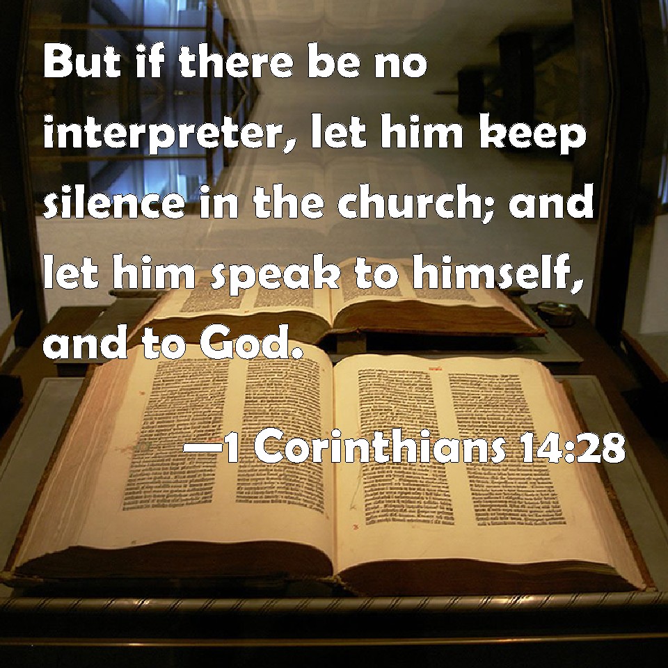 Choose a Background 1 Corinthians 14:28 But if there be no interpreter, let him keep silence in the church; and let him speak to himself, and to God. KJV: But if there be no interpreter, let him keep silence in the church; and let him speak to himself, and to God. DRB: But if there be no interpreter, let him hold his peace in the church, and speak to himself and to God. DBT: but if there be no interpreter, let him be silent in the assembly, and let him speak to himself and to God. ERV: but if there be no interpreter, let him keep silence in the church; and let him speak to himself, and to God. WBT: But if there is no interpreter, let him keep silence in the church; and let him speak to himself, and to God. WEB: But if there is no interpreter, let him keep silent in the assembly, and let him speak to himself, and to God. YLT: and if there may be no interpreter, let him be silent in an assembly, and to himself let him speak, and to God.Links 1 Corinthians 14:28 NIV • 1 Corinthians 14:28 NLT • 1 Corinthians 14:28 ESV • 1 Corinthians 14:28 NASB • 1 Corinthians 14:28 KJV • 1 Corinthians 14:28 Interlinear • 1 Corinthians 14:28 Commentaries • 1 Corinthians 14:28 Parallel Texts • 1 Corinthians 14:28 Bible Apps • 1 Corinthians 14:28 Parallel • Bible Hub |