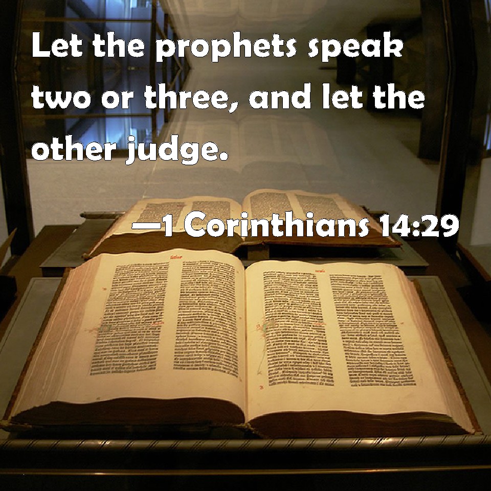 Choose a Background 1 Corinthians 14:29 Let the prophets speak two or three, and let the other judge. KJV: Let the prophets speak two or three, and let the other judge. DRB: And let the prophets speak, two or three; and let the rest judge. DBT: And let two or three prophets speak, and let the others judge. ERV: And let the prophets speak by two or three, and let the others discern. WBT: Let the prophets speak two or three, and let the others judge. WEB: Let the prophets speak, two or three, and let the others discern. YLT: And prophets — let two or three speak, and let the others discern,Links 1 Corinthians 14:29 NIV • 1 Corinthians 14:29 NLT • 1 Corinthians 14:29 ESV • 1 Corinthians 14:29 NASB • 1 Corinthians 14:29 KJV • 1 Corinthians 14:29 Interlinear • 1 Corinthians 14:29 Commentaries • 1 Corinthians 14:29 Parallel Texts • 1 Corinthians 14:29 Bible Apps • 1 Corinthians 14:29 Parallel • Bible Hub |
