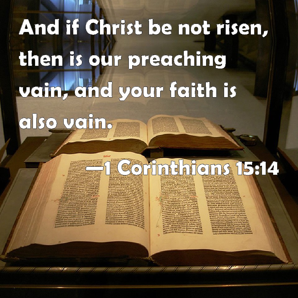 Choose a Background 1 Corinthians 15:14 And if Christ be not risen, then is our preaching vain, and your faith is also vain. KJV: And if Christ be not risen, then is our preaching vain, and your faith is also vain. DRB: And if Christ be not risen again, then is our preaching vain, and your faith is also vain. DBT: but if Christ is not raised, then, indeed, vain also is our preaching, and vain also your faith. ERV: and if Christ hath not been raised, then is our preaching vain, your faith also is vain. WBT: And if Christ is not raised, then is our preaching vain, and your faith is also vain. WEB: If Christ has not been raised, then our preaching is in vain, and your faith also is in vain. YLT: and if Christ hath not risen, then void is our preaching, and void also your faith,Links 1 Corinthians 15:14 NIV • 1 Corinthians 15:14 NLT • 1 Corinthians 15:14 ESV • 1 Corinthians 15:14 NASB • 1 Corinthians 15:14 KJV • 1 Corinthians 15:14 Interlinear • 1 Corinthians 15:14 Commentaries • 1 Corinthians 15:14 Parallel Texts • 1 Corinthians 15:14 Bible Apps • 1 Corinthians 15:14 Parallel • Bible Hub |
