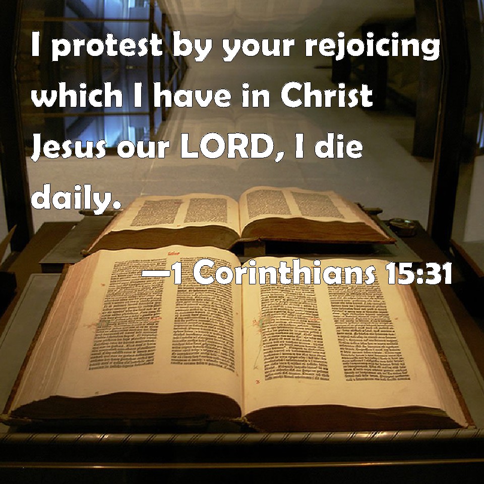 Choose a Background 1 Corinthians 15:31 I protest by your rejoicing which I have in Christ Jesus our LORD, I die daily. KJV: I protest by your rejoicing which I have in Christ Jesus our Lord, I die daily. DRB: I die daily, I protest by your glory, brethren, which I have in Christ Jesus our Lord. DBT: Daily I die, by your boasting which I have in Christ Jesus our Lord. ERV: I protest by that glorying in you, brethren, which I have in Christ Jesus our Lord, I die daily. WBT: I protest by your rejoicing which I have in Christ Jesus our Lord, I die daily. WEB: I affirm, by the boasting in you which I have in Christ Jesus our Lord, I die daily. YLT: Every day do I die, by the glorying of you that I have in Christ Jesus our Lord:Links 1 Corinthians 15:31 NIV • 1 Corinthians 15:31 NLT • 1 Corinthians 15:31 ESV • 1 Corinthians 15:31 NASB • 1 Corinthians 15:31 KJV • 1 Corinthians 15:31 Interlinear • 1 Corinthians 15:31 Commentaries • 1 Corinthians 15:31 Parallel Texts • 1 Corinthians 15:31 Bible Apps • 1 Corinthians 15:31 Parallel • Bible Hub |