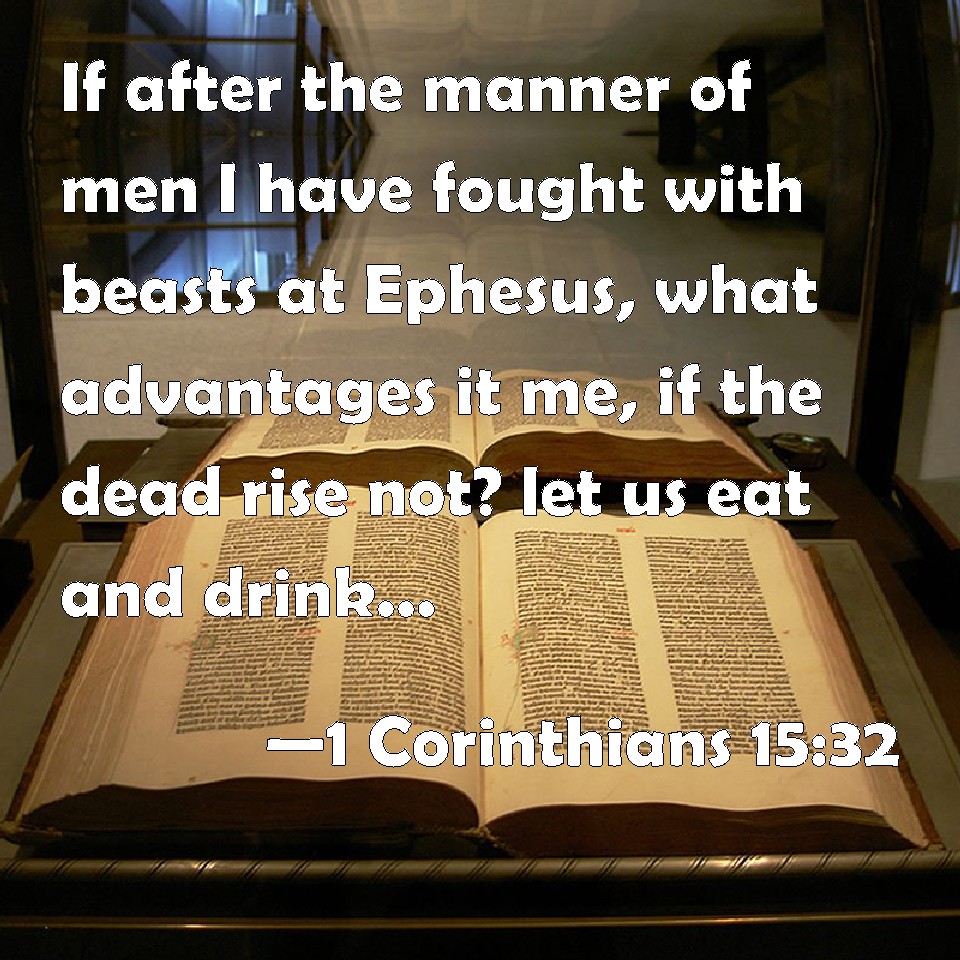 Choose a Background 1 Corinthians 15:32 If after the manner of men I have fought with beasts at Ephesus, what advantages it me, if the dead rise not? let us eat and drink; for to morrow we die. KJV: If after the manner of men I have fought with beasts at Ephesus, what advantageth it me, if the dead rise not? let us eat and drink; for to morrow we die. DRB: If (according to man) I fought with beasts at Ephesus, what doth it profit me, if the dead rise not again? Let us eat and drink, for to morrow we shall die. DBT: If, to speak after the manner of man, I have fought with beasts in Ephesus, what is the profit to me if those that are dead do not rise? let us eat and drink; for to-morrow we die. ERV: If after the manner of men I fought with beasts at Ephesus, what doth it profit me? If the dead are not raised, let us eat and drink, for tomorrow we die. WBT: If after the manner of men I have fought with beasts at Ephesus, what advantage is it to me, if the dead rise not? let us eat and drink; for to-morrow we die. WEB: If I fought with animals at Ephesus for human purposes, what does it profit me? If the dead are not raised, then "let us eat and drink, for tomorrow we die." YLT: if after the manner of a man with wild beasts I fought in Ephesus, what the advantage to me if the dead do not rise? let us eat and drink, for to-morrow we die!Links 1 Corinthians 15:32 NIV • 1 Corinthians 15:32 NLT • 1 Corinthians 15:32 ESV • 1 Corinthians 15:32 NASB • 1 Corinthians 15:32 KJV • 1 Corinthians 15:32 Interlinear • 1 Corinthians 15:32 Commentaries • 1 Corinthians 15:32 Parallel Texts • 1 Corinthians 15:32 Bible Apps • 1 Corinthians 15:32 Parallel • Bible Hub |