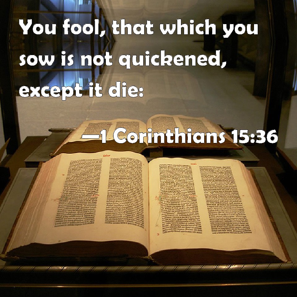 Choose a Background 1 Corinthians 15:36 You fool, that which you sow is not quickened, except it die: KJV: Thou fool, that which thou sowest is not quickened, except it die: DRB: Senseless man, that which thou sowest is not quickened, except it die first. DBT: Fool; what thou sowest is not quickened unless it die. ERV: Thou foolish one, that which thou thyself sowest is not quickened, except it die: WBT: Thou fool, that which thou sowest is not vivified except it die: WEB: You foolish one, that which you yourself sow is not made alive unless it dies. YLT: unwise! thou — what thou dost sow is not quickened except it may die;Links 1 Corinthians 15:36 NIV • 1 Corinthians 15:36 NLT • 1 Corinthians 15:36 ESV • 1 Corinthians 15:36 NASB • 1 Corinthians 15:36 KJV • 1 Corinthians 15:36 Interlinear • 1 Corinthians 15:36 Commentaries • 1 Corinthians 15:36 Parallel Texts • 1 Corinthians 15:36 Bible Apps • 1 Corinthians 15:36 Parallel • Bible Hub |