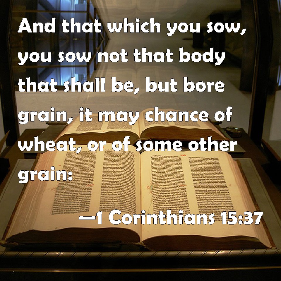 Choose a Background 1 Corinthians 15:37 And that which you sow, you sow not that body that shall be, but bore grain, it may chance of wheat, or of some other grain: KJV: And that which thou sowest, thou sowest not that body that shall be, but bare grain, it may chance of wheat, or of some other grain: DRB: And that which thou sowest, thou sowest not the body that shall be; but bare grain, as of wheat, or of some of the rest. DBT: And what thou sowest, thou sowest not the body that shall be, but a bare grain: it may be of wheat, or some one of the rest: ERV: and that which thou sowest, thou sowest not the body that shall be, but a bare grain, it may chance of wheat, or of some other kind; WBT: And that which thou sowest, thou sowest not that body that shall be, but bare grain; it may be of wheat, or of some other grain: WEB: That which you sow, you don't sow the body that will be, but a bare grain, maybe of wheat, or of some other kind. YLT: and that which thou dost sow, not the body that shall be dost thou sow, but bare grain, it may be of wheat, or of some one of the others,Links 1 Corinthians 15:37 NIV • 1 Corinthians 15:37 NLT • 1 Corinthians 15:37 ESV • 1 Corinthians 15:37 NASB • 1 Corinthians 15:37 KJV • 1 Corinthians 15:37 Interlinear • 1 Corinthians 15:37 Commentaries • 1 Corinthians 15:37 Parallel Texts • 1 Corinthians 15:37 Bible Apps • 1 Corinthians 15:37 Parallel • Bible Hub |