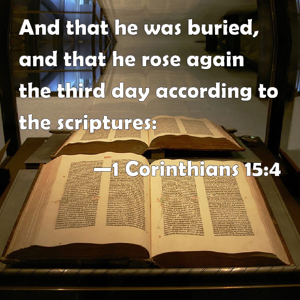 Choose a Background 1 Corinthians 15:4 And that he was buried, and that he rose again the third day according to the scriptures: KJV: And that he was buried, and that he rose again the third day according to the scriptures: DRB: And that he was buried, and that he rose again the third day, according to the scriptures: DBT: and that he was buried; and that he was raised the third day, according to the scriptures; ERV: and that he was buried; and that he hath been raised on the third day according to the scriptures; WBT: And that he was buried, and that he rose again the third day according to the scriptures: WEB: that he was buried, that he was raised on the third day according to the Scriptures, YLT: and that he was buried, and that he hath risen on the third day, according to the Writings,Links 1 Corinthians 15:4 NIV • 1 Corinthians 15:4 NLT • 1 Corinthians 15:4 ESV • 1 Corinthians 15:4 NASB • 1 Corinthians 15:4 KJV • 1 Corinthians 15:4 Interlinear • 1 Corinthians 15:4 Commentaries • 1 Corinthians 15:4 Parallel Texts • 1 Corinthians 15:4 Bible Apps • 1 Corinthians 15:4 Parallel • Bible Hub |