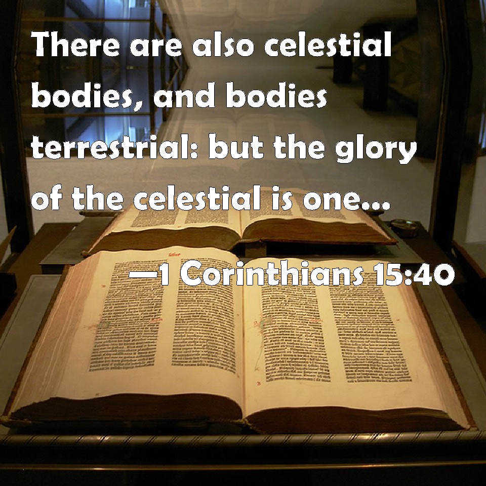 Choose a Background 1 Corinthians 15:40 There are also celestial bodies, and bodies terrestrial: but the glory of the celestial is one, and the glory of the terrestrial is another. KJV: There are also celestial bodies, and bodies terrestrial: but the glory of the celestial is one, and the glory of the terrestrial is another. DRB: And there are bodies celestial, and bodies terrestrial: but, one is the glory of the celestial, and another of the terrestrial. DBT: And there are heavenly bodies, and earthly bodies: but different is the glory of the heavenly, different that of the earthly: ERV: There are also celestial bodies, and bodies terrestrial: but the glory of the celestial is one, and the glory of the terrestrial is another. WBT: There are also celestial bodies, and bodies terrestrial: but the glory of the celestial is one, and the glory of the terrestrial is another. WEB: There are also celestial bodies, and terrestrial bodies; but the glory of the celestial differs from that of the terrestrial. YLT: and there are heavenly bodies, and earthly bodies; but one is the glory of the heavenly, and another that of the earthly;Links 1 Corinthians 15:40 NIV • 1 Corinthians 15:40 NLT • 1 Corinthians 15:40 ESV • 1 Corinthians 15:40 NASB • 1 Corinthians 15:40 KJV • 1 Corinthians 15:40 Interlinear • 1 Corinthians 15:40 Commentaries • 1 Corinthians 15:40 Parallel Texts • 1 Corinthians 15:40 Bible Apps • 1 Corinthians 15:40 Parallel • Bible Hub |