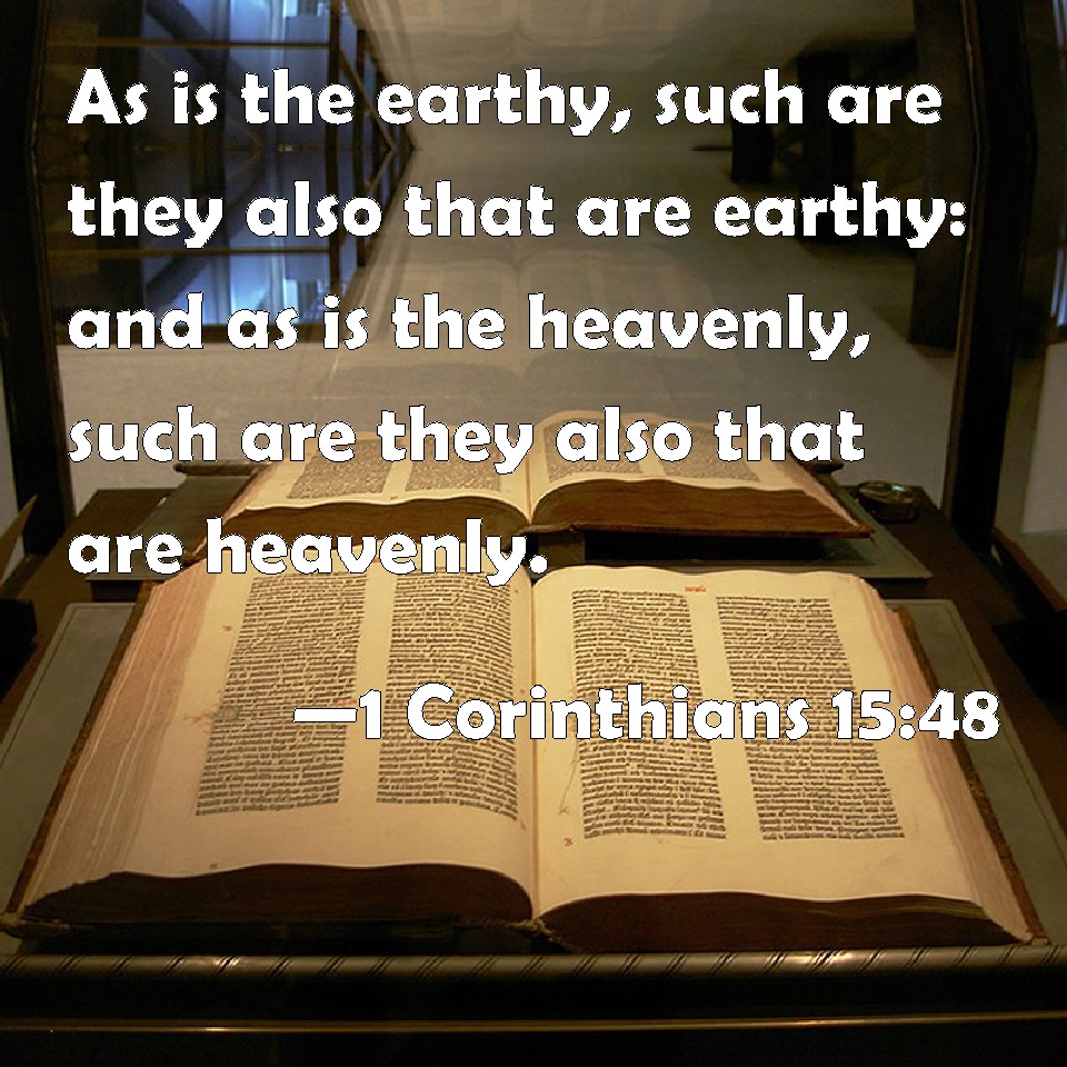 Choose a Background 1 Corinthians 15:48 As is the earthy, such are they also that are earthy: and as is the heavenly, such are they also that are heavenly. KJV: As is the earthy, such are they also that are earthy: and as is the heavenly, such are they also that are heavenly. DRB: Such as is the earthly, such also are the earthly: and such as is the heavenly, such also are they that are heavenly. DBT: Such as he made of dust, such also those made of dust; and such as the heavenly one, such also the heavenly ones. ERV: As is the earthy, such are they also that are earthy: and as is the heavenly, such are they also that are heavenly. WBT: As is the earthy, such are they also that are earthy: and as is the heavenly, such are they also that are heavenly. WEB: As is the one made of dust, such are those who are also made of dust; and as is the heavenly, such are they also that are heavenly. YLT: as is the earthy, such are also the earthy; and as is the heavenly, such are also the heavenly;Links 1 Corinthians 15:48 NIV • 1 Corinthians 15:48 NLT • 1 Corinthians 15:48 ESV • 1 Corinthians 15:48 NASB • 1 Corinthians 15:48 KJV • 1 Corinthians 15:48 Interlinear • 1 Corinthians 15:48 Commentaries • 1 Corinthians 15:48 Parallel Texts • 1 Corinthians 15:48 Bible Apps • 1 Corinthians 15:48 Parallel • Bible Hub |
