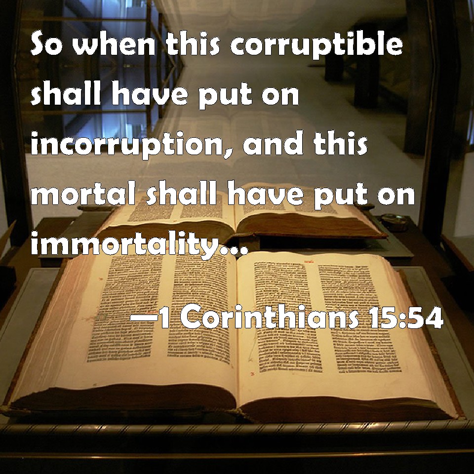 Choose a Background 1 Corinthians 15:54 So when this corruptible shall have put on incorruption, and this mortal shall have put on immortality, then shall be brought to pass the saying that is written, Death is swallowed up in victory. KJV: So when this corruptible shall have put on incorruption, and this mortal shall have put on immortality, then shall be brought to pass the saying that is written, Death is swallowed up in victory. DRB: And when this mortal hath put on immortality, then shall come to pass the saying that is written: Death is swallowed up in victory. DBT: But when this corruptible shall have put on incorruptibility, and this mortal shall have put on immortality, then shall come to pass the word written: Death has been swallowed up in victory. ERV: But when this corruptible shall have put on incorruption, and this mortal shall have put on immortality, then shall come to pass the saying that is written, Death is swallowed up in victory. WBT: So when this corruptible shall have put on incorruption, and this mortal shall have put on immortality, then shall be brought to pass the saying that is written, Death is swallowed up in victory. WEB: But when this corruptible will have put on incorruption, and this mortal will have put on immortality, then what is written will happen: "Death is swallowed up in victory." YLT: and when this corruptible may have put on incorruption, and this mortal may have put on immortality, then shall be brought to pass the word that hath been written, 'The Death was swallowed up — to victory;Links 1 Corinthians 15:54 NIV • 1 Corinthians 15:54 NLT • 1 Corinthians 15:54 ESV • 1 Corinthians 15:54 NASB • 1 Corinthians 15:54 KJV • 1 Corinthians 15:54 Interlinear • 1 Corinthians 15:54 Commentaries • 1 Corinthians 15:54 Parallel Texts • 1 Corinthians 15:54 Bible Apps • 1 Corinthians 15:54 Parallel • Bible Hub |