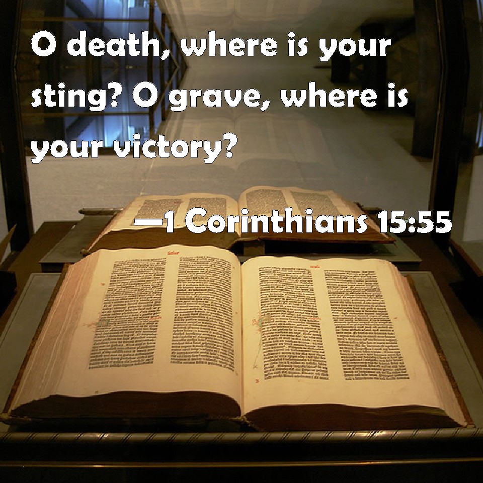 Choose a Background 1 Corinthians 15:55 O death, where is your sting? O grave, where is your victory? KJV: O death, where is thy sting? O grave, where is thy victory? DRB: O death, where is thy victory? O death, where is thy sting? DBT: Where, O death, is thy sting? where, O death, thy victory? ERV: O death, where is thy victory? O death, where is thy sting? WBT: O death, where is thy sting? O grave, where is thy victory? WEB: "Death, where is your sting? Hades, where is your victory?" YLT: where, O Death, thy sting? where, O Hades, thy victory?'Links 1 Corinthians 15:55 NIV • 1 Corinthians 15:55 NLT • 1 Corinthians 15:55 ESV • 1 Corinthians 15:55 NASB • 1 Corinthians 15:55 KJV • 1 Corinthians 15:55 Interlinear • 1 Corinthians 15:55 Commentaries • 1 Corinthians 15:55 Parallel Texts • 1 Corinthians 15:55 Bible Apps • 1 Corinthians 15:55 Parallel • Bible Hub |
