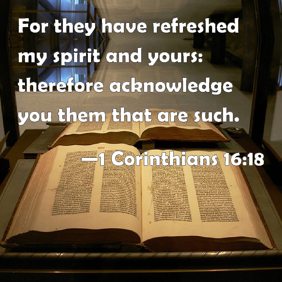 1 Corinthians 16:18 For they have refreshed my spirit and yours: therefore acknowledge you them that are such.