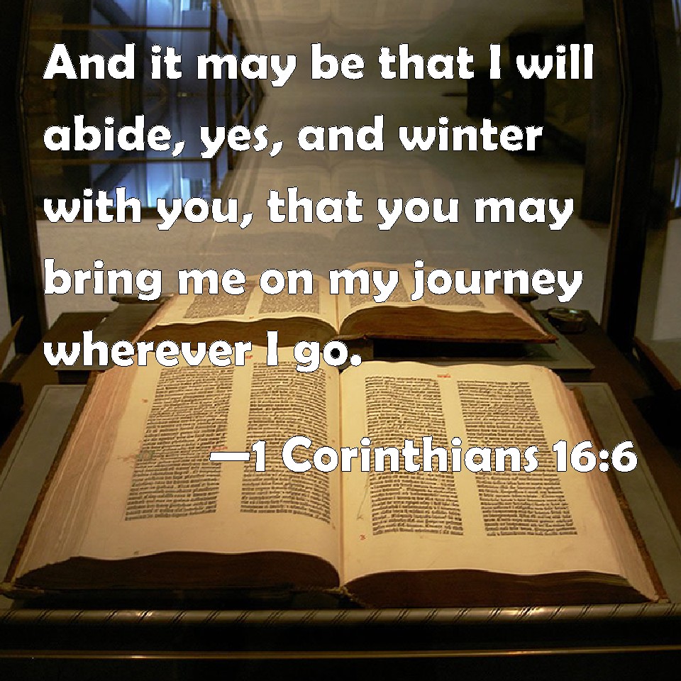 Choose a Background 1 Corinthians 16:6 And it may be that I will abide, yes, and winter with you, that you may bring me on my journey wherever I go. KJV: And it may be that I will abide, yea, and winter with you, that ye may bring me on my journey whithersoever I go. DRB: And with you perhaps I shall abide, or even spend the winter: that you may bring me on my way whithersoever I shall go. DBT: But perhaps I will stay with you, or even winter with you, that ye may set me forward wheresoever I may go. ERV: but with you it may be that I shall abide, or even winter, that ye may set me forward on my journey whithersoever I go. WBT: And it may be that I shall abide, and even winter with you, that ye may bring me on my journey whithersoever I go. WEB: But with you it may be that I will stay, or even winter, that you may send me on my journey wherever I go. YLT: and with you, it may be, I will abide, or even winter, that ye may send me forward whithersoever I go,Links 1 Corinthians 16:6 NIV • 1 Corinthians 16:6 NLT • 1 Corinthians 16:6 ESV • 1 Corinthians 16:6 NASB • 1 Corinthians 16:6 KJV • 1 Corinthians 16:6 Interlinear • 1 Corinthians 16:6 Commentaries • 1 Corinthians 16:6 Parallel Texts • 1 Corinthians 16:6 Bible Apps • 1 Corinthians 16:6 Parallel • Bible Hub |