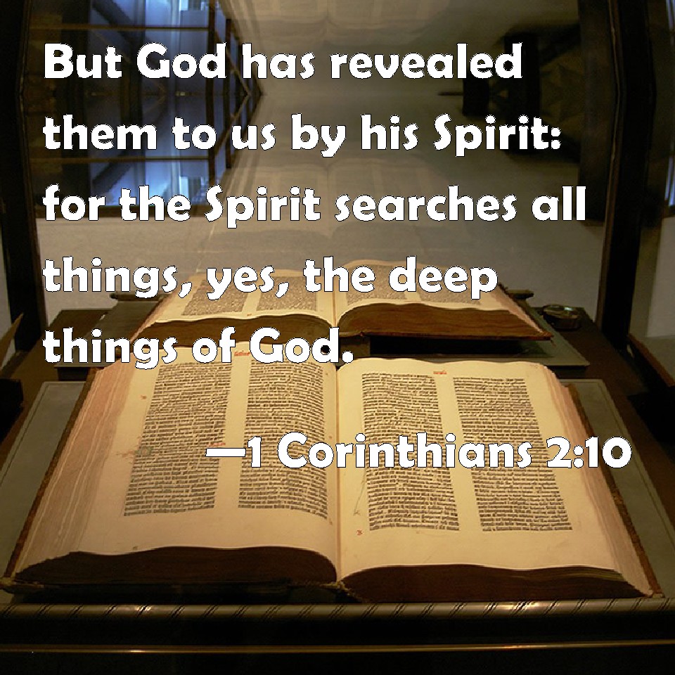 Choose a Background 1 Corinthians 2:10 But God has revealed them to us by his Spirit: for the Spirit searches all things, yes, the deep things of God. KJV: But God hath revealed them unto us by his Spirit: for the Spirit searcheth all things, yea, the deep things of God. DRB: But to us God hath revealed them, by this Spirit. For the Spirit searcheth all things, yea, the deep things of God. DBT: but God has revealed to us by his Spirit; for the Spirit searches all things, even the depths of God. ERV: But unto us God revealed them through the Spirit: for the Spirit searcheth all things, yea, the deep things of God. WBT: But God hath revealed them to us by his Spirit; for the Spirit searcheth all things, even the deep things of God. WEB: But to us, God revealed them through the Spirit. For the Spirit searches all things, yes, the deep things of God. YLT: but to us did God reveal them through His Spirit, for the Spirit all things doth search, even the depths of God,Links 1 Corinthians 2:10 NIV • 1 Corinthians 2:10 NLT • 1 Corinthians 2:10 ESV • 1 Corinthians 2:10 NASB • 1 Corinthians 2:10 KJV • 1 Corinthians 2:10 Interlinear • 1 Corinthians 2:10 Commentaries • 1 Corinthians 2:10 Parallel Texts • 1 Corinthians 2:10 Bible Apps • 1 Corinthians 2:10 Parallel • Bible Hub |