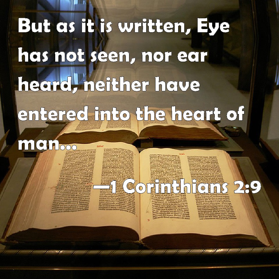 Choose a Background 1 Corinthians 2:9 But as it is written, Eye has not seen, nor ear heard, neither have entered into the heart of man, the things which God has prepared for them that love him. KJV: But as it is written, Eye hath not seen, nor ear heard, neither have entered into the heart of man, the things which God hath prepared for them that love him. DRB: But, as it is written: That eye hath not seen, nor ear heard, neither hath it entered into the heart of man, what things God hath prepared for them that love him. DBT: but according as it is written, Things which eye has not seen, and ear not heard, and which have not come into man's heart, which God has prepared for them that love him, ERV: but as it is written, Things which eye saw not, and ear heard not, And which entered not into the heart of man, Whatsoever things God prepared for them that love him. WBT: But as it is written, Eye hath not seen, nor ear heard, neither have entered into the heart of man, the things which God hath prepared for them that love him. WEB: But as it is written, "Things which an eye didn't see, and an ear didn't hear, which didn't enter into the heart of man, these God has prepared for those who love him." YLT: but, according as it hath been written, 'What eye did not see, and ear did not hear, and upon the heart of man came not up, what God did prepare for those loving Him — 'Links 1 Corinthians 2:9 NIV • 1 Corinthians 2:9 NLT • 1 Corinthians 2:9 ESV • 1 Corinthians 2:9 NASB • 1 Corinthians 2:9 KJV • 1 Corinthians 2:9 Interlinear • 1 Corinthians 2:9 Commentaries • 1 Corinthians 2:9 Parallel Texts • 1 Corinthians 2:9 Bible Apps • 1 Corinthians 2:9 Parallel • Bible Hub |