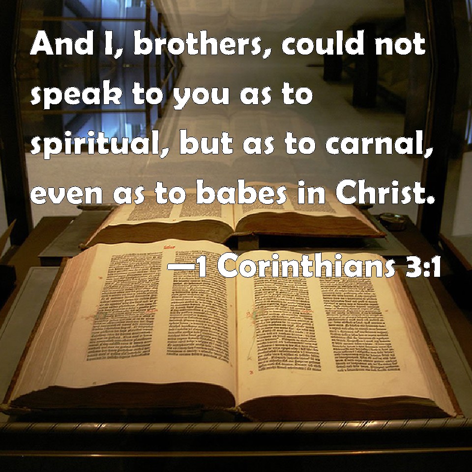 Choose a Background 1 Corinthians 3:1 And I, brothers, could not speak to you as to spiritual, but as to carnal, even as to babes in Christ. KJV: And I, brethren, could not speak unto you as unto spiritual, but as unto carnal, even as unto babes in Christ. DRB: AND I, brethren, could not speak to you as unto spiritual, but as unto carnal. As unto little ones in Christ. DBT: And I, brethren, have not been able to speak to you as to spiritual, but as to fleshly; as to babes in Christ. ERV: And I, brethren, could not speak unto you as unto spiritual, but as unto carnal, as unto babes in Christ. WBT: And I, brethren, could not speak to you as to spiritual, but as to carnal, even as to babes in Christ. WEB: Brothers, I couldn't speak to you as to spiritual, but as to fleshly, as to babies in Christ. YLT: And I, brethren, was not able to speak to you as to spiritual, but as to fleshly — as to babes in Christ;Links 1 Corinthians 3:1 NIV • 1 Corinthians 3:1 NLT • 1 Corinthians 3:1 ESV • 1 Corinthians 3:1 NASB • 1 Corinthians 3:1 KJV • 1 Corinthians 3:1 Interlinear • 1 Corinthians 3:1 Commentaries • 1 Corinthians 3:1 Parallel Texts • 1 Corinthians 3:1 Bible Apps • 1 Corinthians 3:1 Parallel • Bible Hub |