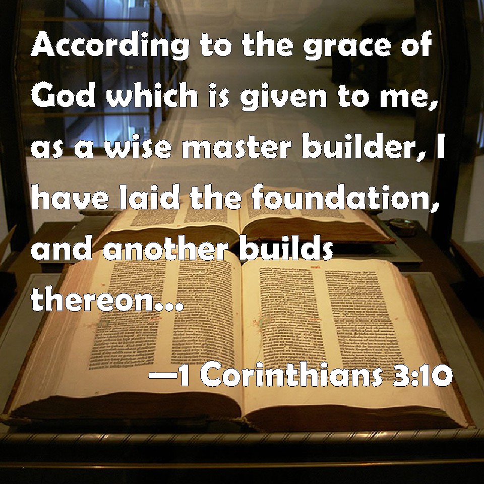 Choose a Background 1 Corinthians 3:10 According to the grace of God which is given to me, as a wise master builder, I have laid the foundation, and another builds thereon. But let every man take heed how he builds thereupon. KJV: According to the grace of God which is given unto me, as a wise masterbuilder, I have laid the foundation, and another buildeth thereon. But let every man take heed how he buildeth thereupon. DRB: According to the grace of God that is given to me, as a wise architect, I have laid the foundation; and another buildeth thereon. But let every man take heed how he buildeth thereupon. DBT: According to the grace of God which has been given to me, as a wise architect, I have laid the foundation, but another builds upon it. But let each see how he builds upon it. ERV: According to the grace of God which was given unto me, as a wise masterbuilder I laid a foundation; and another buildeth thereon. But let each man take heed how he buildeth thereon. WBT: According to the grace of God which is given to me, as a wise master-builder, I have laid the foundation, and another buildeth upon it. But let every man take heed how he buildeth upon it. WEB: According to the grace of God which was given to me, as a wise master builder I laid a foundation, and another builds on it. But let each man be careful how he builds on it. YLT: According to the grace of God that was given to me, as a wise master-builder, a foundation I have laid, and another doth build on it,Links 1 Corinthians 3:10 NIV • 1 Corinthians 3:10 NLT • 1 Corinthians 3:10 ESV • 1 Corinthians 3:10 NASB • 1 Corinthians 3:10 KJV • 1 Corinthians 3:10 Interlinear • 1 Corinthians 3:10 Commentaries • 1 Corinthians 3:10 Parallel Texts • 1 Corinthians 3:10 Bible Apps • 1 Corinthians 3:10 Parallel • Bible Hub |