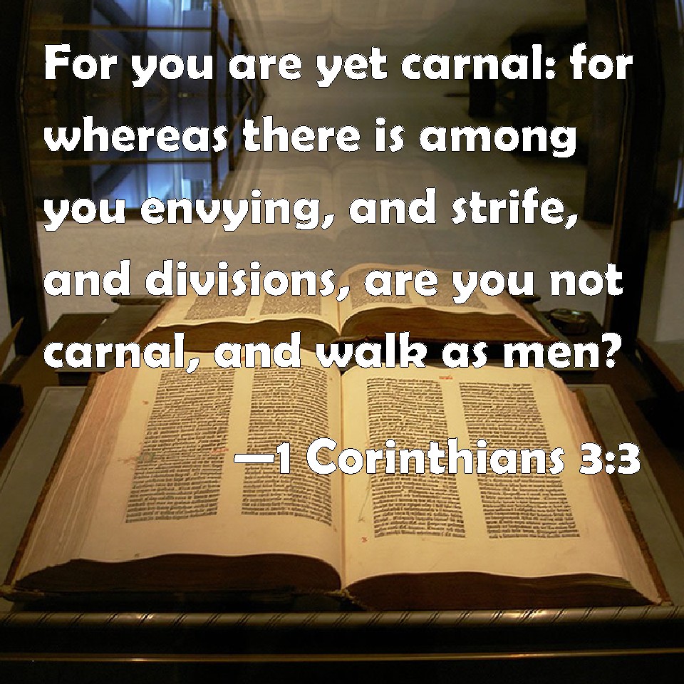 Choose a Background 1 Corinthians 3:3 For you are yet carnal: for whereas there is among you envying, and strife, and divisions, are you not carnal, and walk as men? KJV: For ye are yet carnal: for whereas there is among you envying, and strife, and divisions, are ye not carnal, and walk as men? DRB: For, whereas there is among you envying and contention, are you not carnal, and walk according to man ? DBT: for ye are yet carnal. For whereas there are among you emulation and strife, are ye not carnal, and walk according to man? ERV: for ye are yet carnal: for whereas there is among you jealousy and strife, are ye not carnal, and walk after the manner of men? WBT: For ye are yet carnal: for whereas there is among you envying, and strife, and divisions, are ye not carnal, and walk as men? WEB: for you are still fleshly. For insofar as there is jealousy, strife, and factions among you, aren't you fleshly, and don't you walk in the ways of men? YLT: for yet ye are fleshly, for where there is among you envying, and strife, and divisions, are ye not fleshly, and in the manner of men do walk?Links 1 Corinthians 3:3 NIV • 1 Corinthians 3:3 NLT • 1 Corinthians 3:3 ESV • 1 Corinthians 3:3 NASB • 1 Corinthians 3:3 KJV • 1 Corinthians 3:3 Interlinear • 1 Corinthians 3:3 Commentaries • 1 Corinthians 3:3 Parallel Texts • 1 Corinthians 3:3 Bible Apps • 1 Corinthians 3:3 Parallel • Bible Hub |