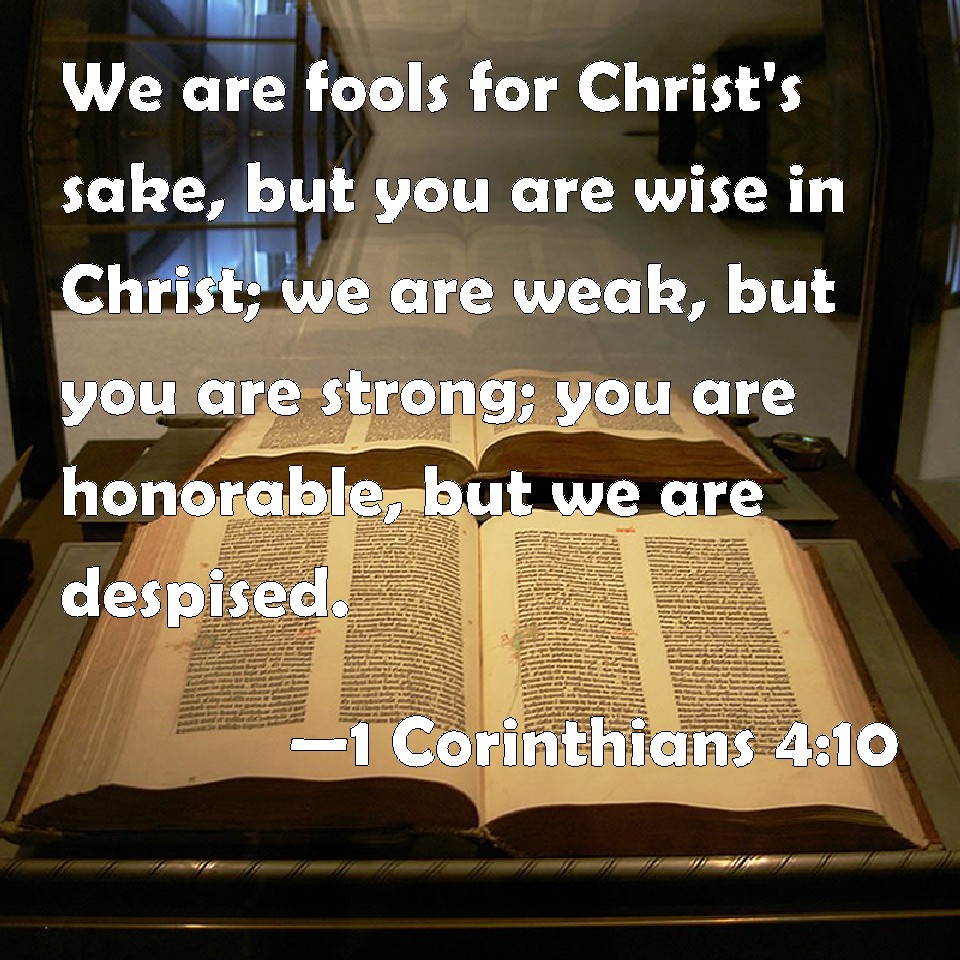 Choose a Background 1 Corinthians 4:10 We are fools for Christ's sake, but you are wise in Christ; we are weak, but you are strong; you are honorable, but we are despised. KJV: We are fools for Christ's sake, but ye are wise in Christ; we are weak, but ye are strong; ye are honourable, but we are despised. DRB: We are fools for Christ's sake, but you are wise in Christ; we are weak, but you are strong; you are honourable, but we without honour. DBT: We are fools for Christ's sake, but ye prudent in Christ: we weak, but ye strong: ye glorious, but we in dishonour. ERV: We are fools for Christ's sake, but ye are wise in Christ; we are weak, but ye are strong; ye have glory, but we have dishonour. WBT: We are fools for Christ's sake, but ye are wise in Christ; we are weak, but ye are strong; ye are honorable, but we are despised. WEB: We are fools for Christ's sake, but you are wise in Christ. We are weak, but you are strong. You have honor, but we have dishonor. YLT: we are fools because of Christ, and ye wise in Christ; we are ailing, and ye strong; ye glorious, and we dishonoured;Links 1 Corinthians 4:10 NIV • 1 Corinthians 4:10 NLT • 1 Corinthians 4:10 ESV • 1 Corinthians 4:10 NASB • 1 Corinthians 4:10 KJV • 1 Corinthians 4:10 Interlinear • 1 Corinthians 4:10 Commentaries • 1 Corinthians 4:10 Parallel Texts • 1 Corinthians 4:10 Bible Apps • 1 Corinthians 4:10 Parallel • Bible Hub |