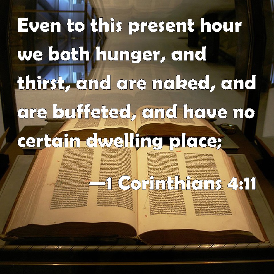 Choose a Background 1 Corinthians 4:11 Even to this present hour we both hunger, and thirst, and are naked, and are buffeted, and have no certain dwelling place; KJV: Even unto this present hour we both hunger, and thirst, and are naked, and are buffeted, and have no certain dwellingplace; DRB: Even unto this hour we both hunger and thirst, and are naked, and are buffeted, and have no fixed abode; DBT: To the present hour we both hunger and thirst, and are in nakedness, and buffeted, and wander without a home, ERV: Even unto this present hour we both hunger, and thirst, and are naked, and are buffeted, and have no certain dwelling place; WBT: Even to this present hour we both hunger, and thirst, and are naked, and are buffeted, and have no certain dwelling-place; WEB: Even to this present hour we hunger, thirst, are naked, are beaten, and have no certain dwelling place. YLT: unto the present hour we both hunger, and thirst, and are naked, and are buffeted, and wander about,Links 1 Corinthians 4:11 NIV • 1 Corinthians 4:11 NLT • 1 Corinthians 4:11 ESV • 1 Corinthians 4:11 NASB • 1 Corinthians 4:11 KJV • 1 Corinthians 4:11 Interlinear • 1 Corinthians 4:11 Commentaries • 1 Corinthians 4:11 Parallel Texts • 1 Corinthians 4:11 Bible Apps • 1 Corinthians 4:11 Parallel • Bible Hub |