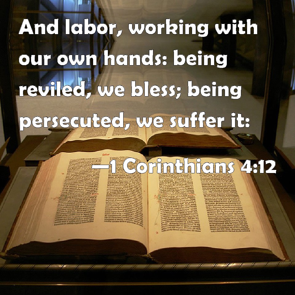 Choose a Background 1 Corinthians 4:12 And labor, working with our own hands: being reviled, we bless; being persecuted, we suffer it: KJV: And labour, working with our own hands: being reviled, we bless; being persecuted, we suffer it: DRB: And we labour, working with our own hands: we are reviled, and we bless; we are persecuted, and we suffer it. DBT: and labour, working with our own hands. Railed at, we bless; persecuted, we suffer it; ERV: and we toil, working with our own hands: being reviled, we bless; being persecuted, we endure; WBT: And labor, working with our own hands. Being reviled, we bless; being persecuted, we suffer it; WEB: We toil, working with our own hands. When people curse us, we bless. Being persecuted, we endure. YLT: and labour, working with our own hands; being reviled, we bless; being persecuted, we suffer;Links 1 Corinthians 4:12 NIV • 1 Corinthians 4:12 NLT • 1 Corinthians 4:12 ESV • 1 Corinthians 4:12 NASB • 1 Corinthians 4:12 KJV • 1 Corinthians 4:12 Interlinear • 1 Corinthians 4:12 Commentaries • 1 Corinthians 4:12 Parallel Texts • 1 Corinthians 4:12 Bible Apps • 1 Corinthians 4:12 Parallel • Bible Hub |