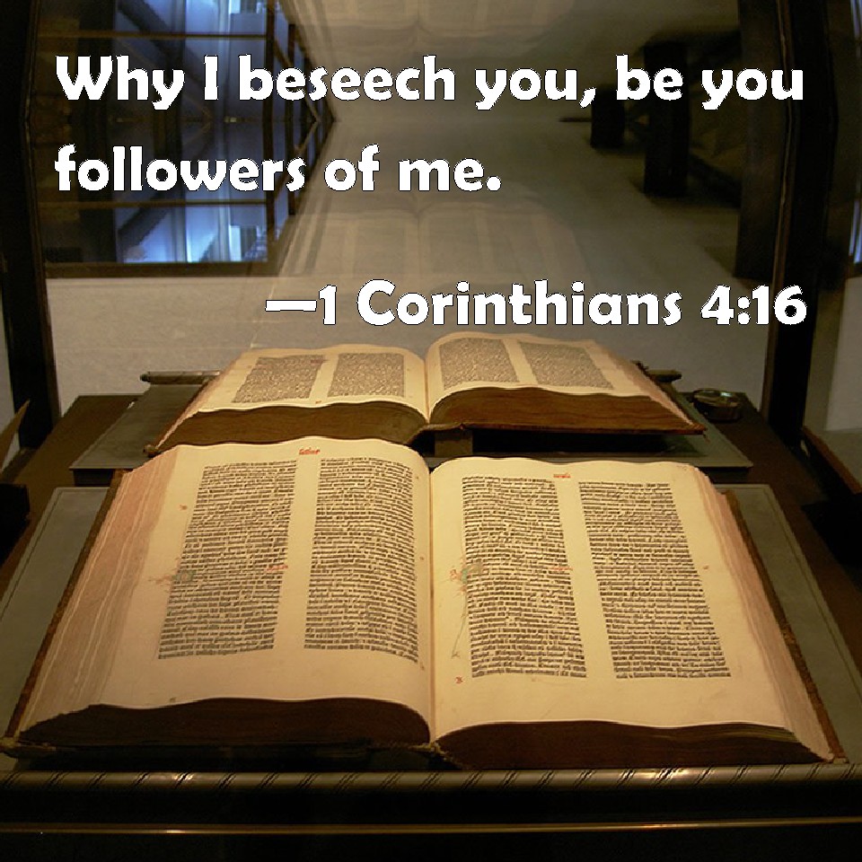 Choose a Background 1 Corinthians 4:16 Why I beseech you, be you followers of me. KJV: Wherefore I beseech you, be ye followers of me. DRB: Wherefore I beseech you, be ye followers of me, as I also am of Christ. DBT: I entreat you therefore, be my imitators. ERV: I beseech you therefore, be ye imitators of me. WBT: Wherefore I beseech you, be ye followers of me. WEB: I beg you therefore, be imitators of me. YLT: I call upon you, therefore, become ye followers of me;Links 1 Corinthians 4:16 NIV • 1 Corinthians 4:16 NLT • 1 Corinthians 4:16 ESV • 1 Corinthians 4:16 NASB • 1 Corinthians 4:16 KJV • 1 Corinthians 4:16 Interlinear • 1 Corinthians 4:16 Commentaries • 1 Corinthians 4:16 Parallel Texts • 1 Corinthians 4:16 Bible Apps • 1 Corinthians 4:16 Parallel • Bible Hub |