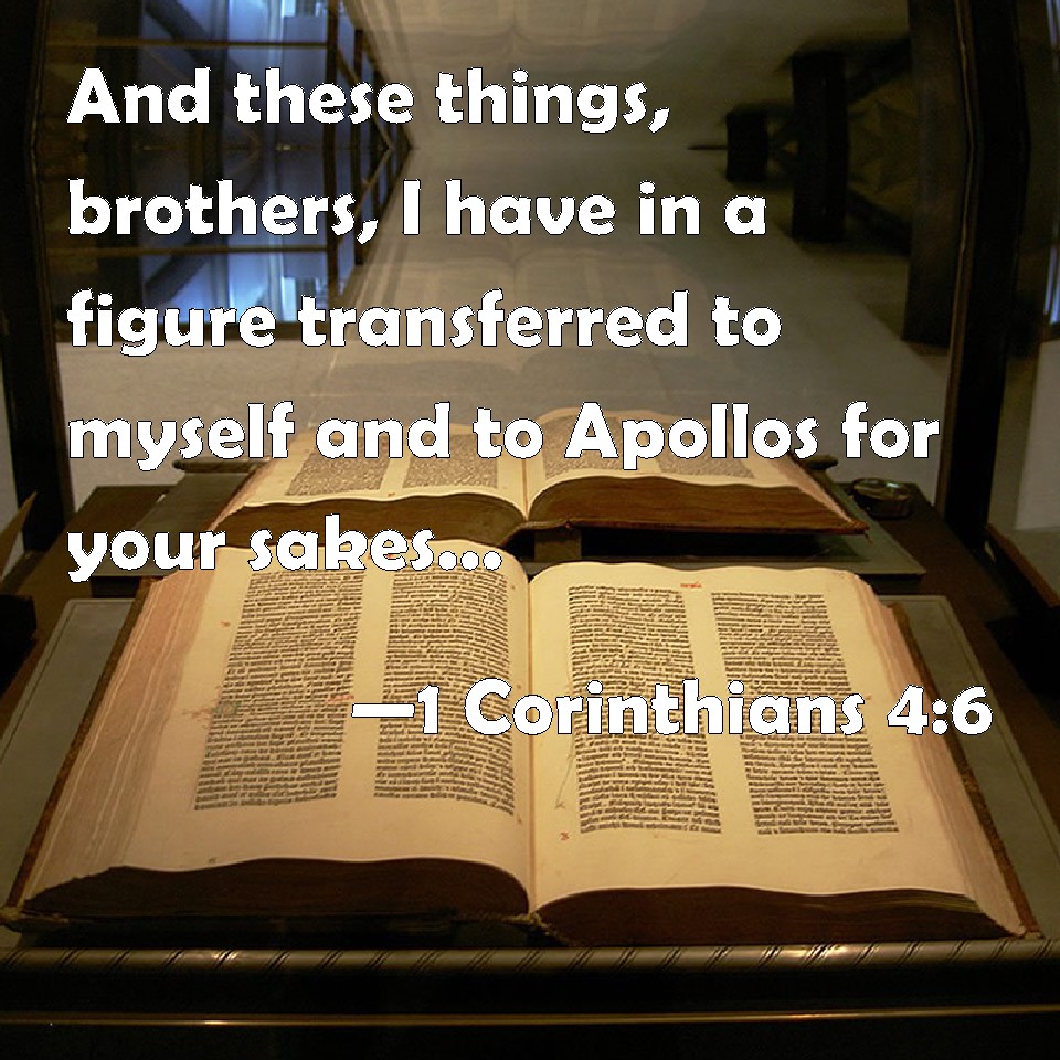 Choose a Background 1 Corinthians 4:6 And these things, brothers, I have in a figure transferred to myself and to Apollos for your sakes; that you might learn in us not to think of men above that which is written, that no one of you be puffed up for one against another. KJV: And these things, brethren, I have in a figure transferred to myself and to Apollos for your sakes; that ye might learn in us not to think of men above that which is written, that no one of you be puffed up for one against another. DRB: But these things, brethren, I have in a figure transferred to myself and to Apollo, for your sakes; that in us you may learn, that one be not puffed up against the other for another, above that which is written. DBT: Now these things, brethren, I have transferred, in their application, to myself and Apollos, for your sakes, that ye may learn in us the lesson of not letting your thoughts go above what is written, that ye may not be puffed up one for such a one against another. ERV: Now these things, brethren, I have in a figure transferred to myself and Apollos for your sakes; that in us ye might learn not to go beyond the things which are written; that no one of you be puffed up for the one against the other. WBT: And these things, brethren, I have in a figure transferred to myself, and to Apollos, for your sakes; that ye may learn in us not to think of men above that which is written, that no one of you on account of one, may be puffed up against another. WEB: Now these things, brothers, I have in a figure transferred to myself and Apollos for your sakes, that in us you might learn not to think beyond the things which are written, that none of you be puffed up against one another. YLT: And these things, brethren, I did transfer to myself and to Apollos because of you, that in us ye may learn not to think above that which hath been written, that ye may not be puffed up one for one against the other,Links 1 Corinthians 4:6 NIV • 1 Corinthians 4:6 NLT • 1 Corinthians 4:6 ESV • 1 Corinthians 4:6 NASB • 1 Corinthians 4:6 KJV • 1 Corinthians 4:6 Interlinear • 1 Corinthians 4:6 Commentaries • 1 Corinthians 4:6 Parallel Texts • 1 Corinthians 4:6 Bible Apps • 1 Corinthians 4:6 Parallel • Bible Hub |