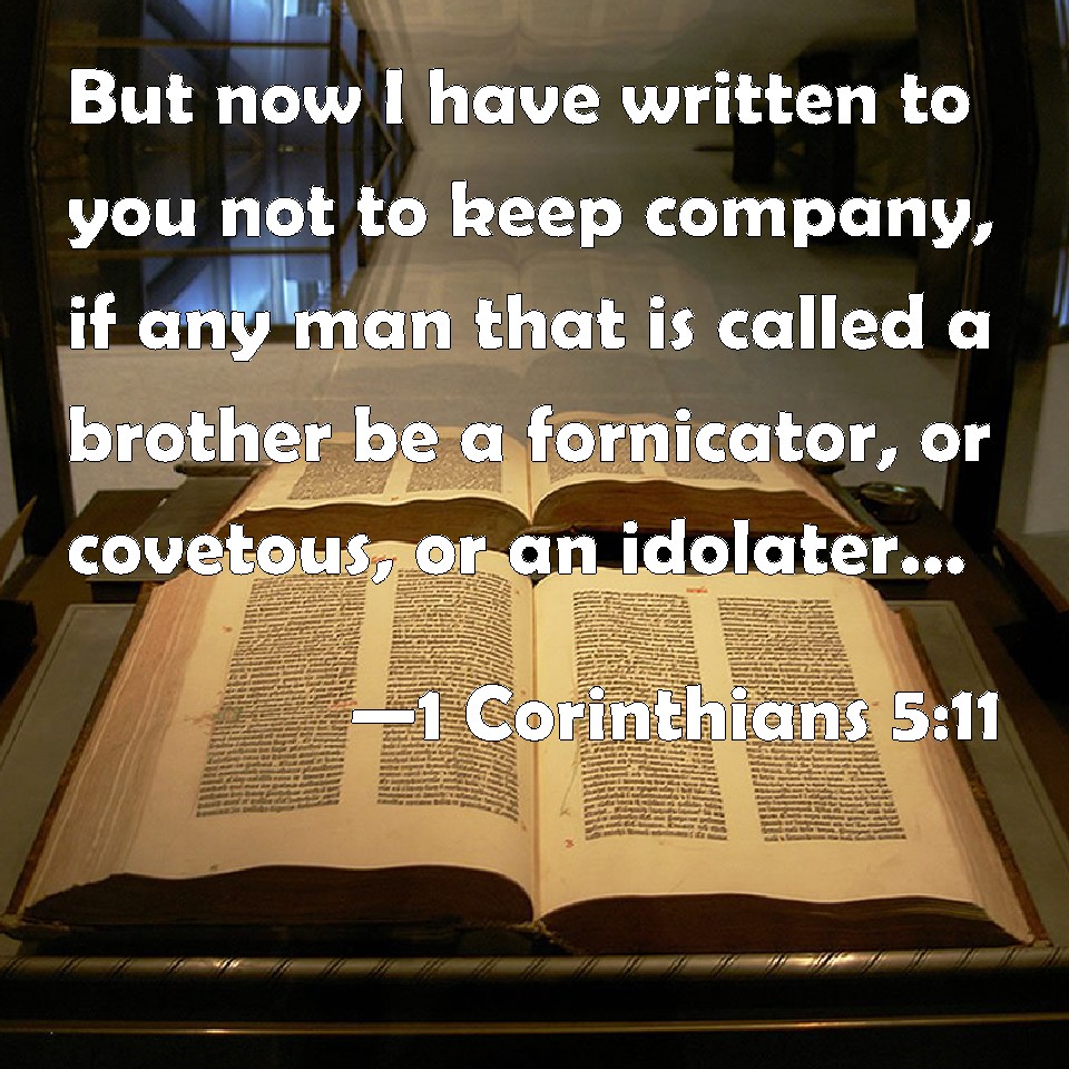 Choose a Background 1 Corinthians 5:11 But now I have written to you not to keep company, if any man that is called a brother be a fornicator, or covetous, or an idolater, or a reviler, or a drunkard, or an extortionist; with such an one no not to eat. KJV: But now I have written unto you not to keep company, if any man that is called a brother be a fornicator, or covetous, or an idolater, or a railer, or a drunkard, or an extortioner; with such an one no not to eat. DRB: But now I have written to you, not to keep company, if any man that is named a brother, be a fornicator, or covetous, or a server of idols, or a railer, or a drunkard, or an extortioner: with such a one, not so much as to eat. DBT: But now I have written to you, if any one called brother be fornicator, or avaricious, or idolater, or abusive, or a drunkard, or rapacious, not to mix with him; with such a one not even to eat. ERV: but now I write unto you not to keep company, if any man that is named a brother be a fornicator, or covetous, or an idolater, or a reviler, or a drunkard, or an extortioner; with such a one no, not to eat. WBT: But now I have written to you not to keep company, if any man that is called a brother is a lewd person, or covetous, or an idolater, or a railer, or a drunkard, or an extortioner: with such person no not to eat. WEB: But as it is, I wrote to you not to associate with anyone who is called a brother who is a sexual sinner, or covetous, or an idolater, or a slanderer, or a drunkard, or an extortioner. Don't even eat with such a person. YLT: and now, I did write to you not to keep company with him, if any one, being named a brother, may be a whoremonger, or covetous, or an idolater, or a railer, or a drunkard, or an extortioner — with such a one not even to eat together;Links 1 Corinthians 5:11 NIV • 1 Corinthians 5:11 NLT • 1 Corinthians 5:11 ESV • 1 Corinthians 5:11 NASB • 1 Corinthians 5:11 KJV • 1 Corinthians 5:11 Interlinear • 1 Corinthians 5:11 Commentaries • 1 Corinthians 5:11 Parallel Texts • 1 Corinthians 5:11 Bible Apps • 1 Corinthians 5:11 Parallel • Bible Hub |