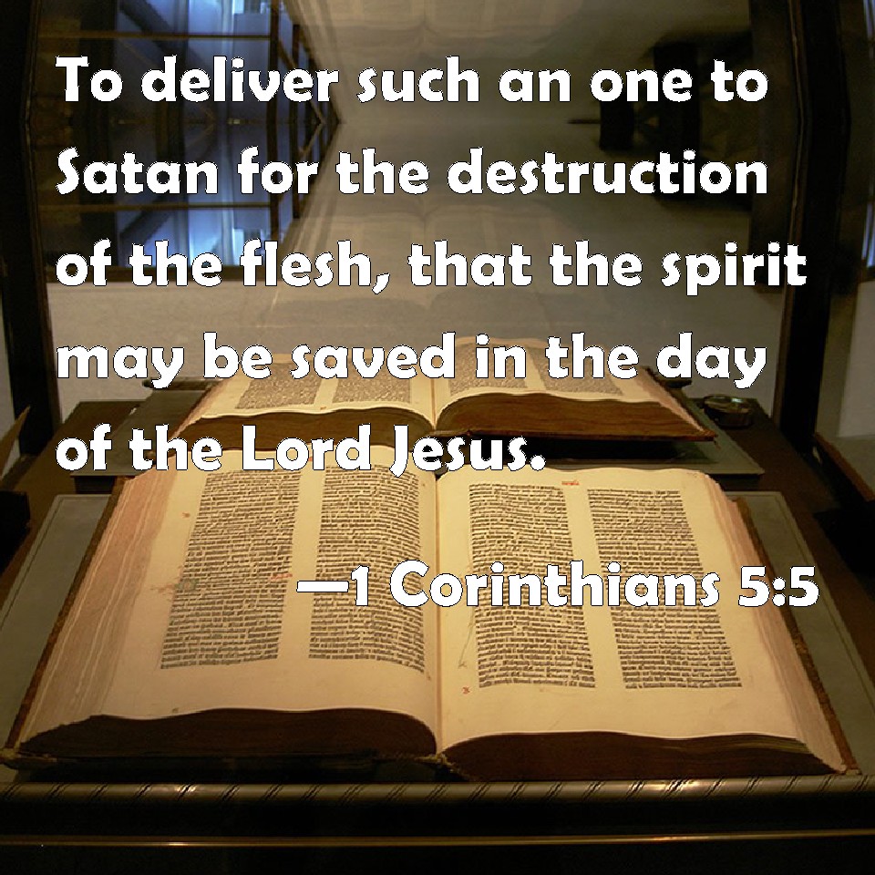 Choose a Background 1 Corinthians 5:5 To deliver such an one to Satan for the destruction of the flesh, that the spirit may be saved in the day of the Lord Jesus. KJV: To deliver such an one unto Satan for the destruction of the flesh, that the spirit may be saved in the day of the Lord Jesus. DRB: To deliver such a one to Satan for the destruction of the flesh, that the spirit may be saved in the day of our Lord Jesus Christ. DBT: to deliver him, I say, being such, to Satan for destruction of the flesh, that the spirit may be saved in the day of the Lord Jesus. ERV: to deliver such a one unto Satan for the destruction of the flesh, that the spirit may be saved in the day of the Lord Jesus. WBT: To deliver such one to Satan for the destruction of the flesh, that the spirit may be saved in the day of the Lord Jesus. WEB: are to deliver such a one to Satan for the destruction of the flesh, that the spirit may be saved in the day of the Lord Jesus. YLT: to deliver up such a one to the Adversary for the destruction of the flesh, that the spirit may be saved in the day of the Lord Jesus.Links 1 Corinthians 5:5 NIV • 1 Corinthians 5:5 NLT • 1 Corinthians 5:5 ESV • 1 Corinthians 5:5 NASB • 1 Corinthians 5:5 KJV • 1 Corinthians 5:5 Interlinear • 1 Corinthians 5:5 Commentaries • 1 Corinthians 5:5 Parallel Texts • 1 Corinthians 5:5 Bible Apps • 1 Corinthians 5:5 Parallel • Bible Hub |
