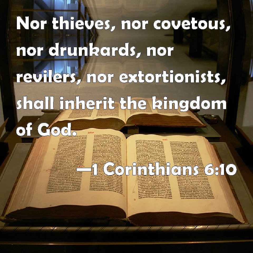 Choose a Background 1 Corinthians 6:10 Nor thieves, nor covetous, nor drunkards, nor revilers, nor extortionists, shall inherit the kingdom of God. KJV: Nor thieves, nor covetous, nor drunkards, nor revilers, nor extortioners, shall inherit the kingdom of God. DRB: Nor the effeminate, nor liers with mankind, nor thieves, nor covetous, nor drunkards, nor railers, nor extortioners, shall possess the kingdom of God. DBT: nor thieves, nor covetous, nor drunkards, nor abusive persons, nor the rapacious, shall inherit the kingdom of God. ERV: nor thieves, nor covetous, nor drunkards, nor revilers, nor extortioners, shall inherit the kingdom of God. WBT: Nor thieves, nor covetous, nor drunkards, nor revilers, nor extortioners, shall inherit the kingdom of God. WEB: nor thieves, nor covetous, nor drunkards, nor slanderers, nor extortioners, will inherit the Kingdom of God. YLT: nor thieves, nor covetous, nor drunkards, nor revilers, nor extortioners, the reign of God shall inherit.Links 1 Corinthians 6:10 NIV • 1 Corinthians 6:10 NLT • 1 Corinthians 6:10 ESV • 1 Corinthians 6:10 NASB • 1 Corinthians 6:10 KJV • 1 Corinthians 6:10 Interlinear • 1 Corinthians 6:10 Commentaries • 1 Corinthians 6:10 Parallel Texts • 1 Corinthians 6:10 Bible Apps • 1 Corinthians 6:10 Parallel • Bible Hub |