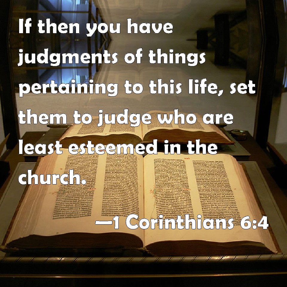 Choose a Background 1 Corinthians 6:4 If then you have judgments of things pertaining to this life, set them to judge who are least esteemed in the church. KJV: If then ye have judgments of things pertaining to this life, set them to judge who are least esteemed in the church. DRB: If therefore you have judgments of things pertaining to this world, set them to judge, who are the most despised in the church. DBT: If then ye have judgments as to things of this life, set those to judge who are little esteemed in the assembly. ERV: If then ye have to judge things pertaining to this life, do ye set them to judge who are of no account in the church? WBT: If then ye have judgments of things pertaining to this life, set them to judge who are least esteemed in the church. WEB: If then, you have to judge things pertaining to this life, do you set them to judge who are of no account in the assembly? YLT: of the things of life, indeed, then, if ye may have judgment, those despised in the assembly — these cause ye to sit;Links 1 Corinthians 6:4 NIV • 1 Corinthians 6:4 NLT • 1 Corinthians 6:4 ESV • 1 Corinthians 6:4 NASB • 1 Corinthians 6:4 KJV • 1 Corinthians 6:4 Interlinear • 1 Corinthians 6:4 Commentaries • 1 Corinthians 6:4 Parallel Texts • 1 Corinthians 6:4 Bible Apps • 1 Corinthians 6:4 Parallel • Bible Hub |