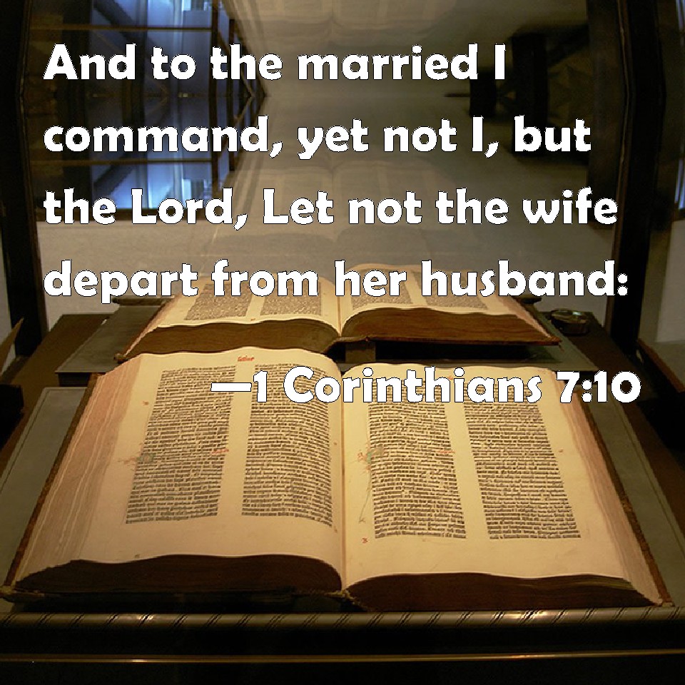 Choose a Background 1 Corinthians 7:10 And to the married I command, yet not I, but the Lord, Let not the wife depart from her husband: KJV: And unto the married I command, yet not I, but the Lord, Let not the wife depart from her husband: DRB: But to them that are married, not I but the Lord commandeth, that the wife depart not from her husband. DBT: But to the married I enjoin, not I, but the Lord, Let not wife be separated from husband; ERV: But unto the married I give charge, yea not I, but the Lord, That the wife depart not from her husband WBT: And to the married I command, yet not I, but the Lord, Let not the wife depart from her husband: WEB: But to the married I command—not I, but the Lord—that the wife not leave her husband YLT: and to the married I announce — not I, but the Lord — let not a wife separate from a husband:Links 1 Corinthians 7:10 NIV • 1 Corinthians 7:10 NLT • 1 Corinthians 7:10 ESV • 1 Corinthians 7:10 NASB • 1 Corinthians 7:10 KJV • 1 Corinthians 7:10 Interlinear • 1 Corinthians 7:10 Commentaries • 1 Corinthians 7:10 Parallel Texts • 1 Corinthians 7:10 Bible Apps • 1 Corinthians 7:10 Parallel • Bible Hub |