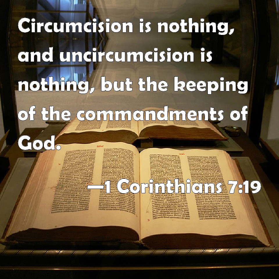 Choose a Background 1 Corinthians 7:19 Circumcision is nothing, and uncircumcision is nothing, but the keeping of the commandments of God. KJV: Circumcision is nothing, and uncircumcision is nothing, but the keeping of the commandments of God. DRB: Circumcision is nothing, and uncircumcision is nothing: but the observance of the commandments of God. DBT: Circumcision is nothing, and uncircumcision is nothing; but keeping God's commandments. ERV: Circumcision is nothing, and uncircumcision is nothing; but the keeping of the commandments of God. WBT: Circumcision is nothing, and uncircumcision is nothing, but the keeping of the commandments of God. WEB: Circumcision is nothing, and uncircumcision is nothing, but the keeping of the commandments of God. YLT: the circumcision is nothing, and the uncircumcision is nothing — but a keeping of the commands of God.Links 1 Corinthians 7:19 NIV • 1 Corinthians 7:19 NLT • 1 Corinthians 7:19 ESV • 1 Corinthians 7:19 NASB • 1 Corinthians 7:19 KJV • 1 Corinthians 7:19 Interlinear • 1 Corinthians 7:19 Commentaries • 1 Corinthians 7:19 Parallel Texts • 1 Corinthians 7:19 Bible Apps • 1 Corinthians 7:19 Parallel • Bible Hub |