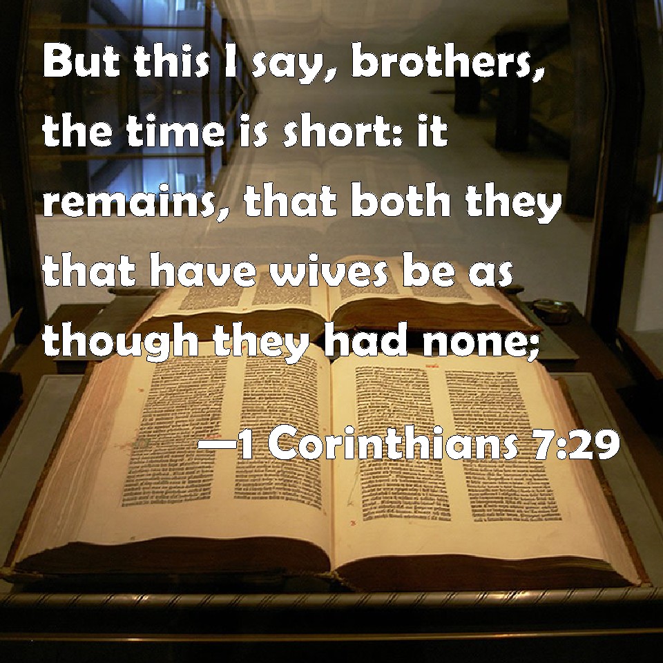 Choose a Background 1 Corinthians 7:29 But this I say, brothers, the time is short: it remains, that both they that have wives be as though they had none; KJV: But this I say, brethren, the time is short: it remaineth, that both they that have wives be as though they had none; DRB: This therefore I say, brethren; the time is short; it remaineth, that they also who have wives, be as if they had none; DBT: But this I say, brethren, the time is straitened. For the rest, that they who have wives, be as not having any: ERV: But this I say, brethren, the time is shortened, that henceforth both those that have wives may be as though they had none; WBT: But this I say, brethren, The time is short. It remaineth, that both they that have wives, be as though they had none; WEB: But I say this, brothers: the time is short, that from now on, both those who have wives may be as though they had none; YLT: And this I say, brethren, the time henceforth is having been shortened — that both those having wives may be as not having;Links 1 Corinthians 7:29 NIV • 1 Corinthians 7:29 NLT • 1 Corinthians 7:29 ESV • 1 Corinthians 7:29 NASB • 1 Corinthians 7:29 KJV • 1 Corinthians 7:29 Interlinear • 1 Corinthians 7:29 Commentaries • 1 Corinthians 7:29 Parallel Texts • 1 Corinthians 7:29 Bible Apps • 1 Corinthians 7:29 Parallel • Bible Hub |